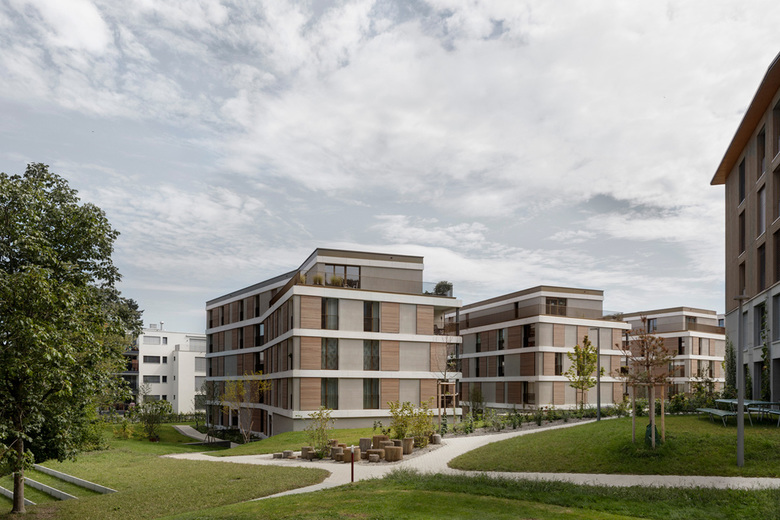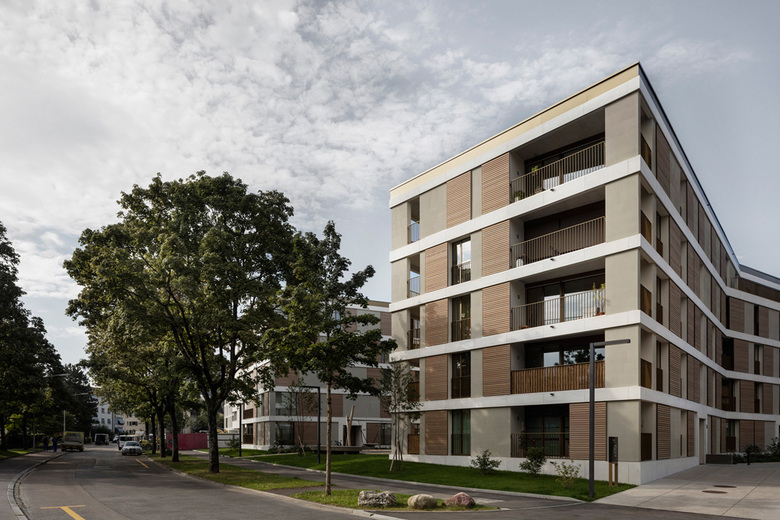 Aus eben dieser Zusammenarbeit resultierte die städtebauliche Entscheidung, dass eine Abfolge von Punkthaus, Bestand und Zeile die optimale Eingliederung des Ensembles an diesem Ort garantiert. Die klar strukturierten Gebäudezeilen wurden leicht gekantet und orientieren sich rechtwinklig zur Strasse. Durch diese Ausrichtung, verbunden mit der Kubatur der Häuser, entstehen fliessende Freiräume zwischen den Zeilen, die dem Wunsch nach einem grünen, dynamischen Quartier entsprechen.