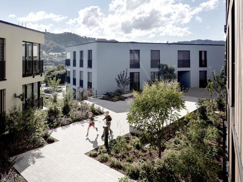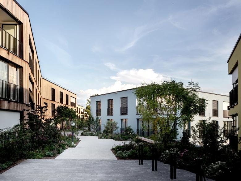 Trotz der freien Form gliedern sich Riegel und Punkthäuser in einem strickten Raster. Aufgrund der Effizienz der sich wiederholenden Grundrissgestaltung und einer vielfältigen Aussenraumgestaltung bietet die Siedlung 70 kostengünstige Genossenschaft-Wohnungen an.