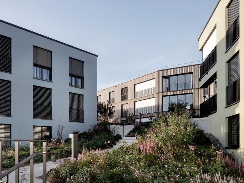 Der Riegel zeigt sich durch seine verputzte Fassade und kleineren Öffnungen gegen die Autobahn geschlossen und öffnet sich mit einer warmen Holzfassade und grosszügigen französischen Fenstern zum Zwischenraum.
