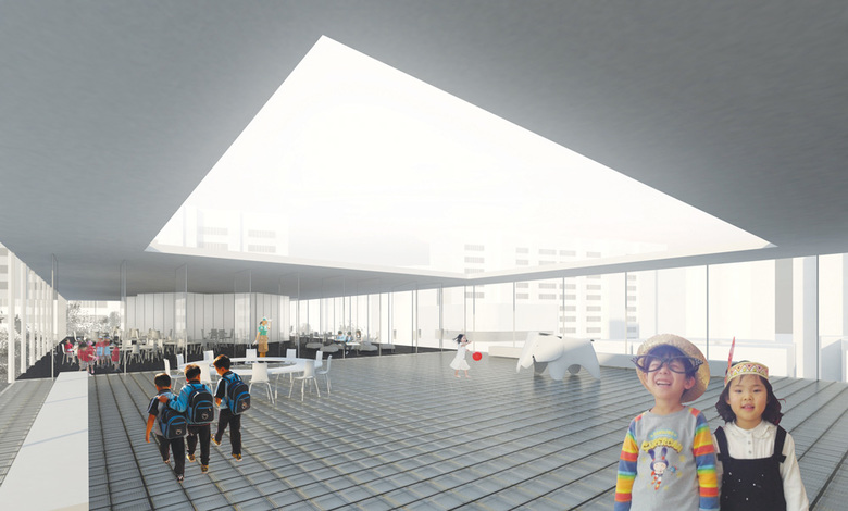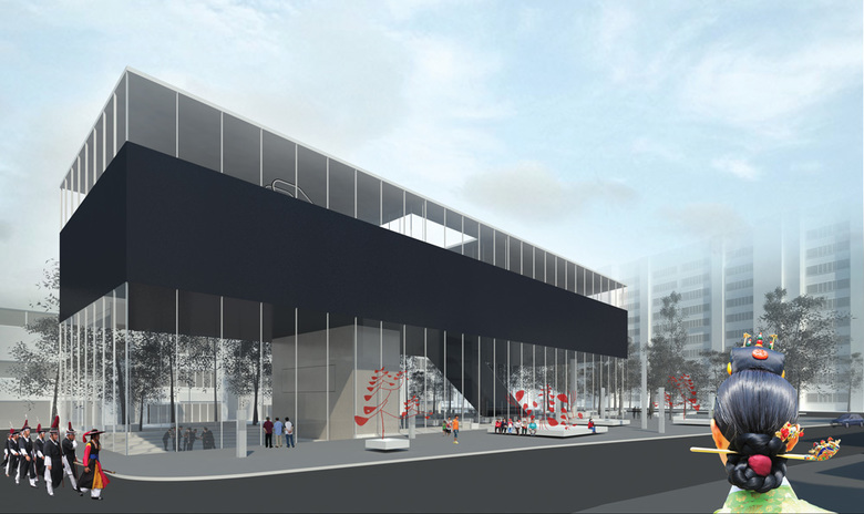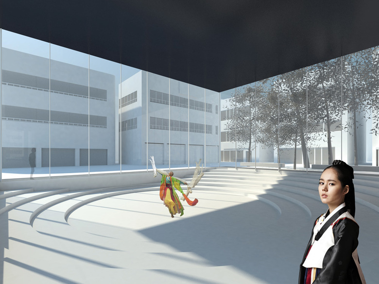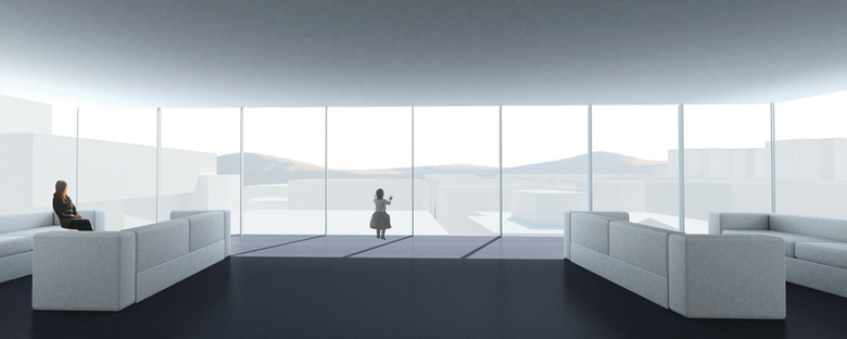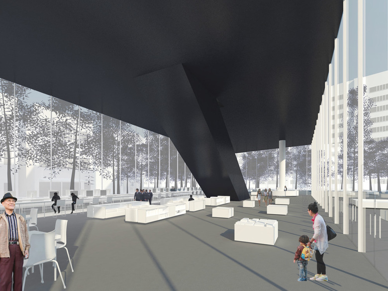 Be it for the inside sequence of spaces or for the outside overall appearance, the clear-cut organization of the building is uncompromising and easily legible: a cultural open lobby (extroverted), a closed library (introverted), an open lounge and children's library (extroverted). The black box contains what could be dubbed a "traditional library space", the core program of the building. It hovers 7 meters above ground in order to shelter the public lobby, the cultural multipurpose spaces, the amphitheater and the digital library on the ground floor. Softer types of library programs such as the lounge and the children's library are placed on top of the library in order to profit of a maximum of sunlight, tranquility and a 360 degrees panoramic view of the city around.