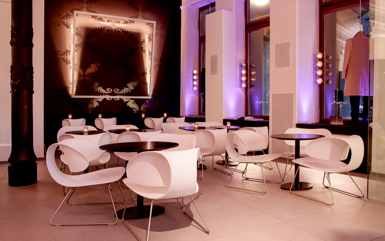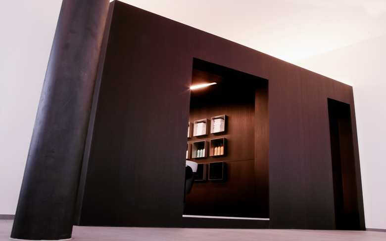 Das Aerni verbindet Boutique, Coiffeur, Spa und Café in historisch wertvollen Jugendstil-Räumlichkeiten. Mit der Gestaltung wurde der historische Bestand hervorgehoben, die Technik feinfühlig und scheinbar unsichtbar integriert. Verbindendes Element im gesamten Raumgefüge sind die schräggestellten Betonkuben, die als Verkaufstheke, Display und als Übergang zum Café-Bereich dienen, wo sie zur Bar werden. Im Café greift die ornamentale Tapete die Stuckaturen des Raumes auf. Die Kleidungsstücke werden in der Boutique auf zurückhaltenden Trägern präsentiert, um den Fokus auf das Produkt zu lenken. Der Coiffeur-Bereich ist gleichmässig ausgeleuchtet, mit Ausnahme des Haarwaschbereichs in einer eingeschobenen Holzbox, der bewusst mit reduzierter Beleuchtung und gedämpfter Geräuschkulisse zum Entspannen einlädt. Der Wellness-Bereich im Untergeschoss bietet mit seinen hochwertigen Materialien und Erd- und Brauntönenein ein Ambiente von Geborgenheit.