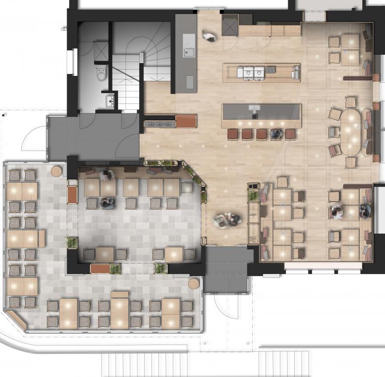 Neben dem historischen Charakter wurde aber auf Modernität nicht verzichtet: Der Barbereich wurde gänzlich erneuert, moderne und traditionelle Deckenverkleidungen greifen ineinander. Schlichte Raumteiler ziehen sich durch alle Bereiche und nehmen auf moderne Art die Strukturierung der Wandtäfer wieder auf. Historische Bilder der Bahnstrecke erinnern an die alten Zeiten, sind jedoch modern mit oxydroten Rahmen und akustischer Wirkung ausgeführt.