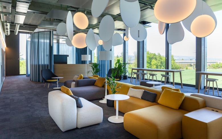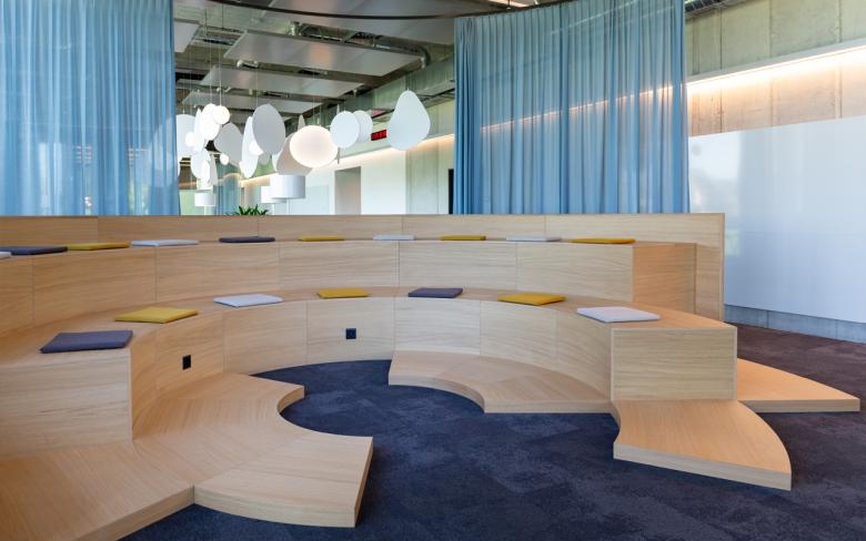 Den Schülern stehen eine Auswahl von verschiedenen Stehtischen, einer Sofalandschaft mit Loungesesseln, einer Holztreppe als Miniauditorium und nach Olympiastädten benannte geschlossene Räume für Gruppenarbeiten oder als Rückzugsort zur Verfügung. Mit dem warmen Material- und Farbkonzept, den Pflanzen und dem warmen Licht wird die Schule eher zu einem atmosphärischen Wohnraum und weniger zu einem klassischen Schulzimmer.