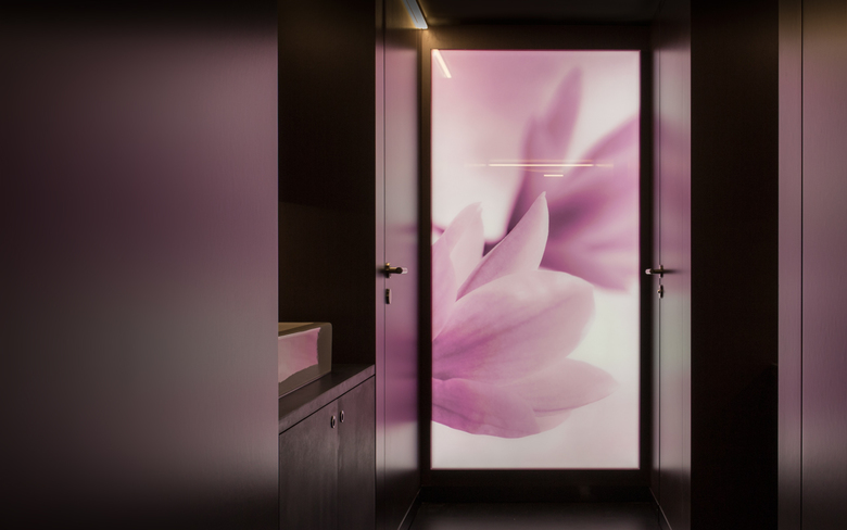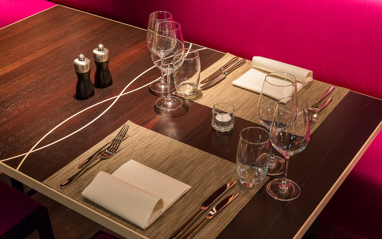Dunkles Holz, warmes Magenta und perlgoldene Akzente schaffen im Aurora an der Bahnhofstrasse Zürich ein edles und modernes Ambiente. Raffiniert gedrehte Holzelemente öffnen optisch die Rückwände und elegante Intarsien im Tisch bilden zusätzliche Hingucker. Zentrales Element des Raumes ist der freistehende Buffetkorpus, der durch goldene Bogenelemente elegant vom Gastraum abgetrennt ist, aber die Transparenz wahrt. In der angegliederten Bar im Erdgeschoss wird der mit Textil bespannte Baroberbau im Abendbetrieb hinterleuchtet, sodass Gläser und Spirituosen sichtbar werden.