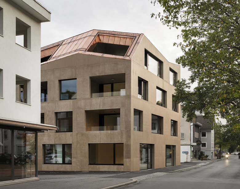 Umso schwieriger das Grundstück, desto kreativer die Lösung. Das nennt man eine Herausforderung. Nicht die einzige. Eine andere, als Vorgabe der Stadt formuliert: Umsetzung einer modernen Interpretation eines Satteldachs als unmittelbarer Typologiebezug zur Architektur der Nachbarschaft. So gesehen wird das Satteldach in verschiedenen Schnittformen zum Maßstab - für die Baukörperteilung und für die Wohnungsaufteilung. Die individuelle Gestaltungsfreiheit bekommt in den 13 Wohneinheiten in der Wohnanlage mehr Spielraum für eine höhere Wohnqualität. Zu den unverrückbaren Fixpunkten der Wohnanlage zählen Kochnische und Bad, alles andere ist für Wünsche der Bewohner noch offen. Das variantenreiche Spiel mit den Fenstern und deren überraschende Anordnung werden zu einem Merkmal des dreigeschossigen Gebäudes. Die Fassade ist Sichtbeton, der eine leichte Farblasur erhält, die die Betonstruktur durchschimmern lässt – Schutz und Farbakzent zugleich.