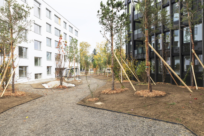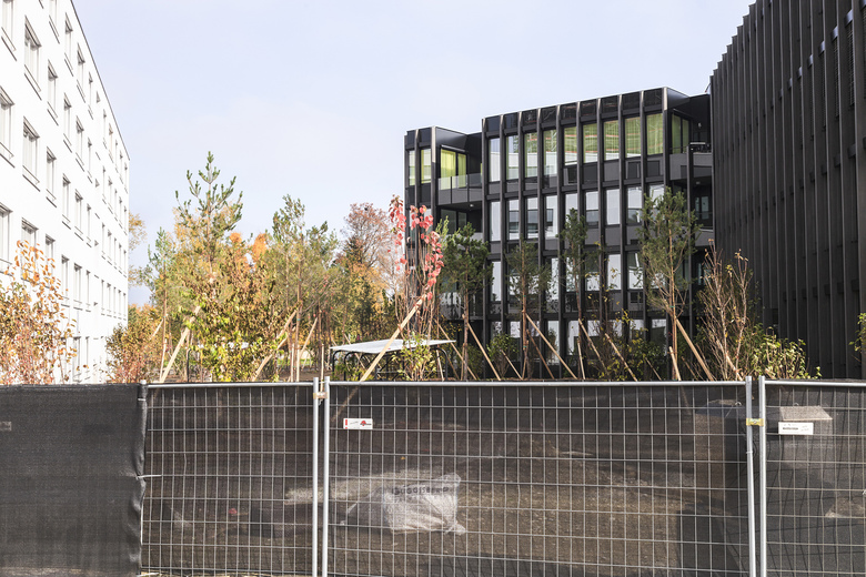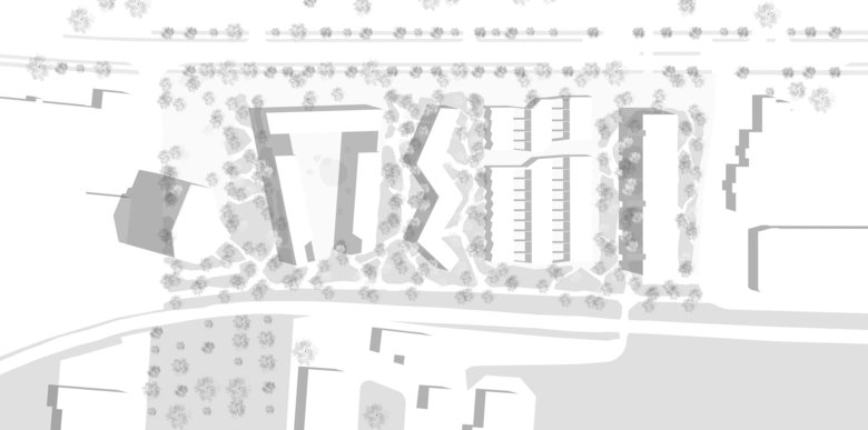 Am Anfang steht das ursprüngliche Konzept Freiraum, welches die Verzahnung von Stadt und Landschaft vorsieht, wobei die Anbindung an die Seftigenstrasse und die Durchlässigkeit Ost-West von zentraler Bedeutung sind. Trotz der diversen, spezifischen Ansprüche fordert der Freiraum Bächtelenacker ein unverwechselbares Gesicht, seinen eigenen Charakter. Dieser soll durch Themen, wie das Aufeinandertreffen von Stadt und Landschaft, Natur und Gartenkultur, formuliert werden. Entsprechend wird ein spielerischer Umgang mit spezifisch zuordenbaren Elementen gesucht, welcher in räumlich komplexen, schichtweisen Überlagerungen mündet. Resultat ist eine, die Gebäude „umfliessende“ Gartenlandschaft, welche durch ihre Art der Ausformulierung die vielfältigen Nutzungsanforderungen zu erfüllen vermag. Die Umsetzung der Idee erfolgt mittels zweier Ebenen: 1. Baumpflanzung - Raum: Ein „Baumgerüst“ welches den teilweise stark unterteilten Freiraum zusammenbindet. Dieses Gerüst wird durch charakterstarke, immergrüne Waldföhren gebildet, welche durch hoch aufgeschnittene Stämme (Säulen) eine Art Halle mit Lichtungen formt. Diese Halle ist in der Lage, spektakulär blühende Gehölze und Kletterpflanzen aufzunehmen, gleichzeitig entstehen durch die lichte Pflanzung zauberhafte Lichtstimmungen. 2. Wegnetz - Terrain: Es wurde eine Flächenstruktur gesucht, welche dem Wunsch nach Durchlässigkeit in Ost- Westrichtung nachkommt, gleichzeitig die vielfältigen Wegverbindungen zulässt und vielseitige Flächennutzung ermöglicht. Ein frei geformtes Netz aus Wegen unterschiedlicher Breiten kommt diesen Bedürfnissen nach und bildet die charakterstarke Basis der Gartenlandschaft.