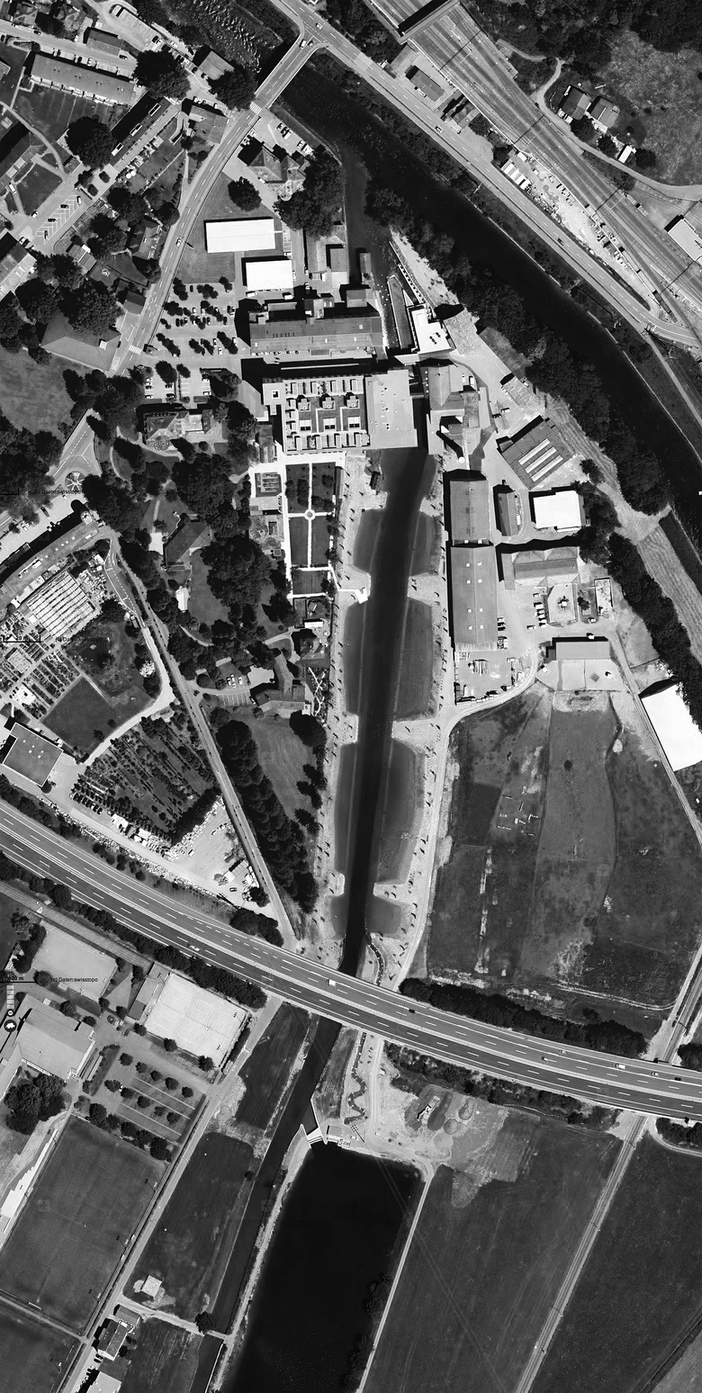 Der Untere Fabrikweiher steht in angrenzender Nachbarschaft zu Obstgarten und Villenpark, geplant von Evariste Mertens in der 2. Hälfte des 19.Jh.. Nordseitig wird der Weiherraum geprägt durch die Fassade des ehemaligen Fabrikgebäudes (heute Loftwohnungen) und ihrer Terrasse. Der Weiher muss als technisches Wasserbauwerk funktionieren (3-5 Entleerungen jährlich) und soll, gemäss der Tradition der künstlich angelegten Kanäle und Teiche zur industriellen Nutzung, auch ein dementsprechendes Gesicht erhalten. Landzungen strukturieren das Gewässer in 5 Kammern, die miteinander verbunden sind und die durch die entsprechende Geländemodellierung im Falle einer Entleerung Ihr Wasser innert kurzer Zeit an das alte Gerinne abgeben. Wasserfassende Rückzugsmulden in Flachwasserbereichen ermöglichen Flora und Fauna in dieser Zeit ein Überleben. Durch die Art und Weise der Geländemodellierung entstehen Böschungen in verschiedenen Neigungen und Expositionen und damit vielfältiger Lebensraum, wo hohe Biodiversität erwartet werden kann. Ein vielfältiges, einheimisches Pflanzensortiment, bestehend aus Gehölzen, Wildstauden, Schwimmblattpflanzen und Wildblumenwiese bildet dafür die Grundlage. Die Loftbewohner erleben den Wasserpark über den leicht erhöhten Holzsteg, welcher vom gemeinschaftlich genutzten Obstgarten ausgehend, der neuen Topographie folgend, über dem Wasser schwebend als Plattform endet. Die Gehölzpflanzung unterstreicht die topografische Vorgabe und reagiert durch Ihr Setzungsprinzip auf die engen Platzverhältnisse; gleichzeitig lenkt sie den Blick. Jahr für Jahr wird das Raumgebilde durch Wachstum stärker. Die ganze Anlage wurde ausschliesslich mit vorhandenen Materialien vor Ort erstellt, was sich ausserordentlich positiv auf Ökologie und Ökonomie auswirkt.