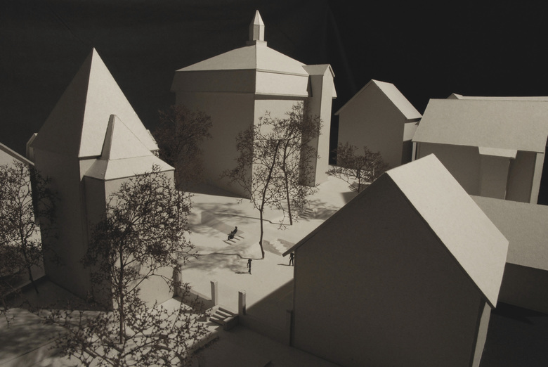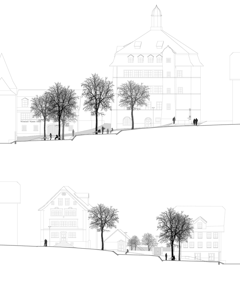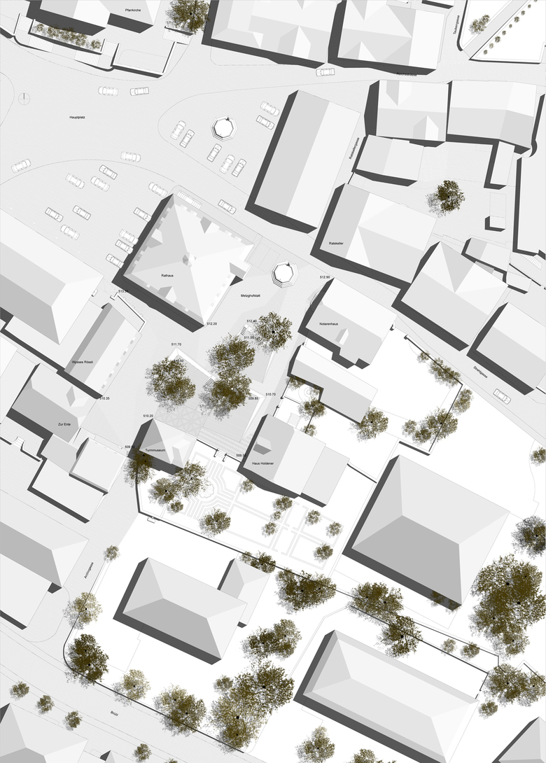 2. Der pragmatische Teil: Beibehalten der bewährten Wege, die die Bewohner von Schwyz seit Jahrzehnten oder Jahrhunderten gehen. Sie verbinden Platzöffnungen, Gassen und Hauseingänge auf kürzestem Weg über die schiefe Ebene. Auf den „Restflächen“ entstehen ebene Nischen, die in die schiefe Ebene einschneiden als wichtige Plätze des Aufenthaltes.