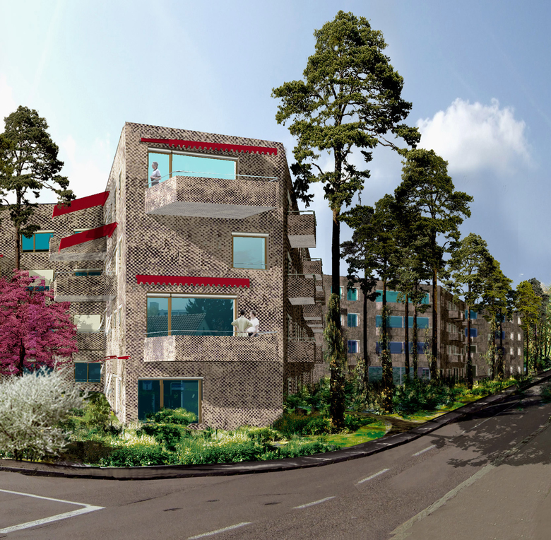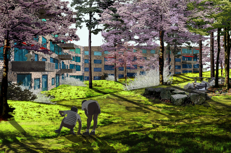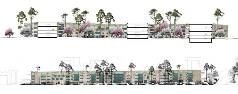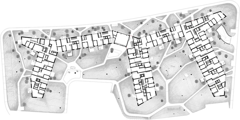 Die Baufigur stösst mit ihren Auslegern in den Siedlungsraum und formt die verschiedenen Räume des Gartens. Gleichzeitig schützt sie vor Emissionen der stark befahrenen, südlich angrenzenden Furttalstrasse. Der Freiraum ist als eine Art „gestapelter Garten“ konzipiert. Über seine Schichtung verbinden sich Landschaftsarchitektur und Architektur zum verspielten Ganzen. Die leicht bewegte Topografie der Rasenfläche mit ihrem Wegnetz aus Stampflehm steht für die starke Basis. Vor den privaten Sitzplätzen bilden Sträucher kleine, intime Freiräume und schützen die Parterrebewohner vor Einblicken. Die Kronen der weiss, rosa und rot blühenden Bäume prägen den Aussenraum; speziell auf der Höhe des ersten und zweiten Obergeschosses. Vereinzelt werden sie geniessbare Früchte hervorbringen. Waldföhren mit ihren langen, braunorangen Stämmen bilden die oberste, immergrüne Kronenschicht. Im ausgewachsenen Zustand werden sie den Wohnbau deutlich überragen. Die Komposition der Bepflanzung erinnert an nahe gelegene Landschaftselemente wie Obstwiese und Nadelwald.