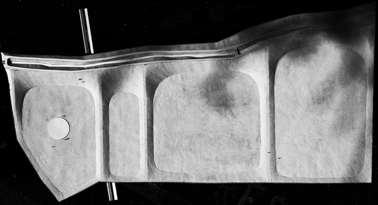 Diese drei Wege sind nicht „das Ziel“ sondern der Beginn: Nämlich die Basis für ein topografisches Skelett, ein räumlich wirksames „Gerüst“ welches durch Erdschüttung einfach und schnell zu bauen ist. Das Material stammt unmittelbar vom Ort und fällt dadurch an, weil die Flächen der Parkzone leicht ausplaniert werden. Die Terrains der Reservezone und anfänglich der Wohnzone werden hierfür nicht tangiert und bleiben bestehen.