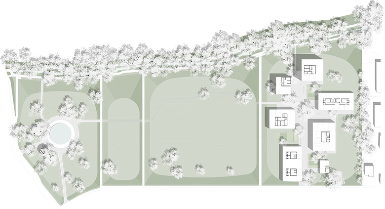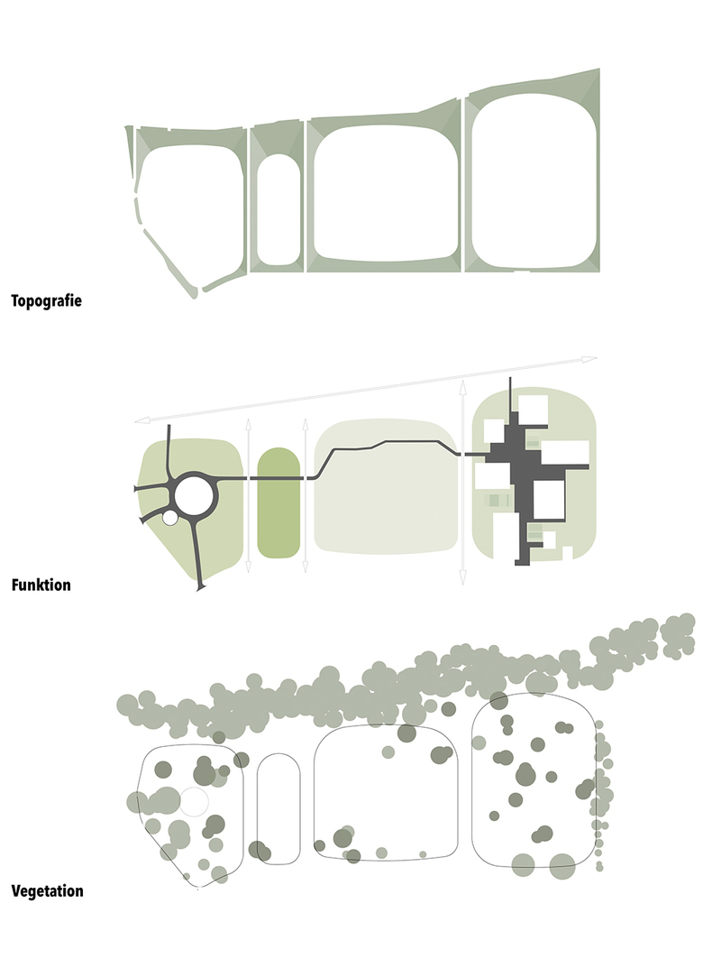 Die Wege sind so angelegt, dass die Flächenansprüche aller drei Nutzungszonen respektiert werden (Masterplan). Auf diese Weise erhält die Anlage eine starke Struktur, deren Teilbereiche in Bezug zu einander stehen und zeitlich unabhängig von einander entwickelbar sind. Die Weitenwirkung in Längsrichtung innerhalb der Wegmatten wird durch die querenden, leicht erhöhten Wege zusätzlich unterstützt und gestärkt.