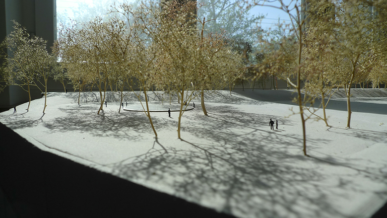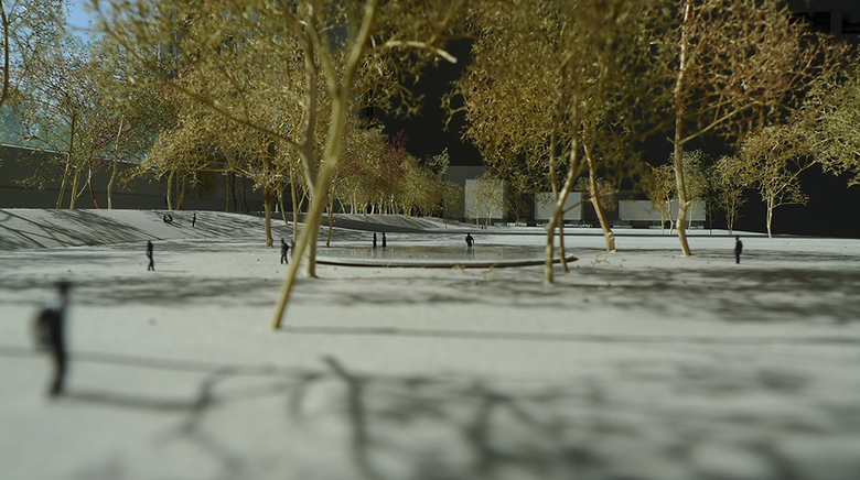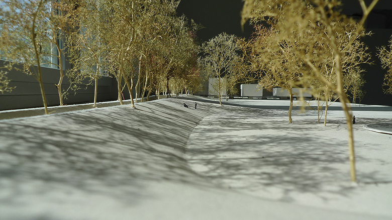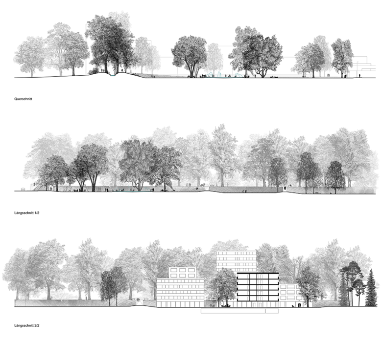 Durch die zonierenden Rampen entstehen vier Teilräume, deren Böschungen sich am Süddamm des Bachgrabens anlehnen und unterschiedlich steil ausgeformt werden, so dass sie genutzt und bespielt werden können.