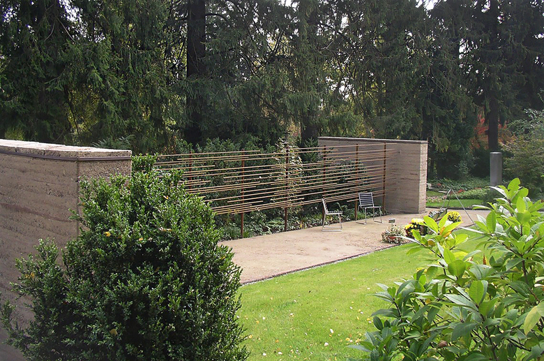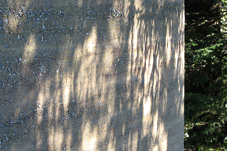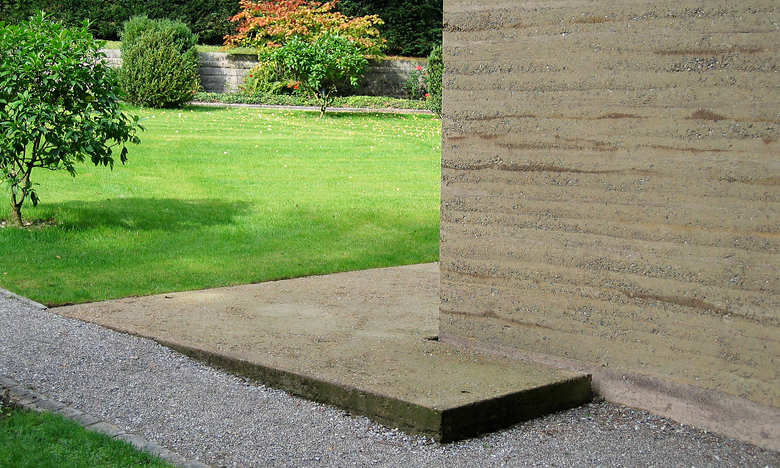 Die gewählten Materialien nehmen auf unterschiedliche Weise Bezug zur Grabstätte: Stampflehm als verdichteter Zustand von Erde, dem letzten Ruheort. Sowie als Metapher von Werden und Vergehen.