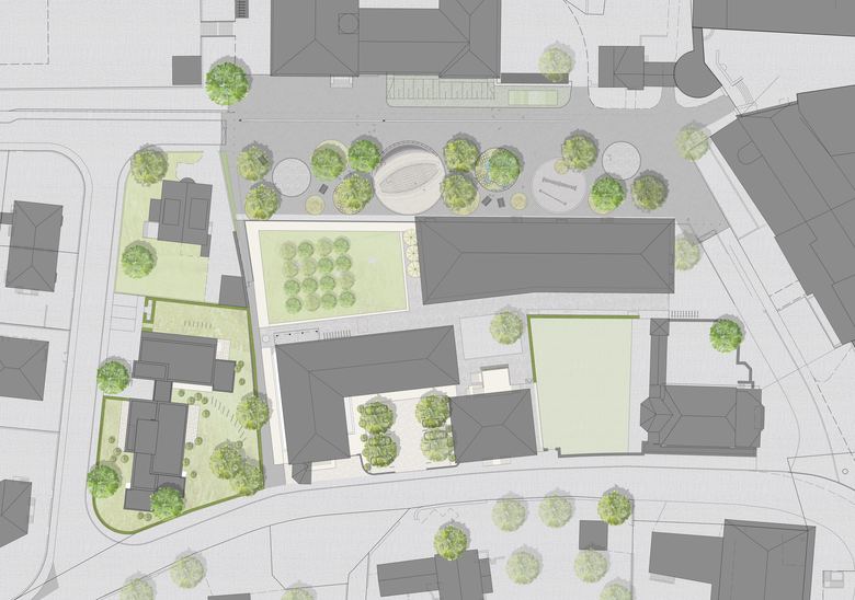 Die Neuordnung der benachbarten Parzellen der Stadt Brugg und des Schweizerischen Bauernverbandes ermöglichte die Neukonzeption des öffentlichen Raumes sowie die Integration des Pausenplatzes des Stapferschulhauses.
