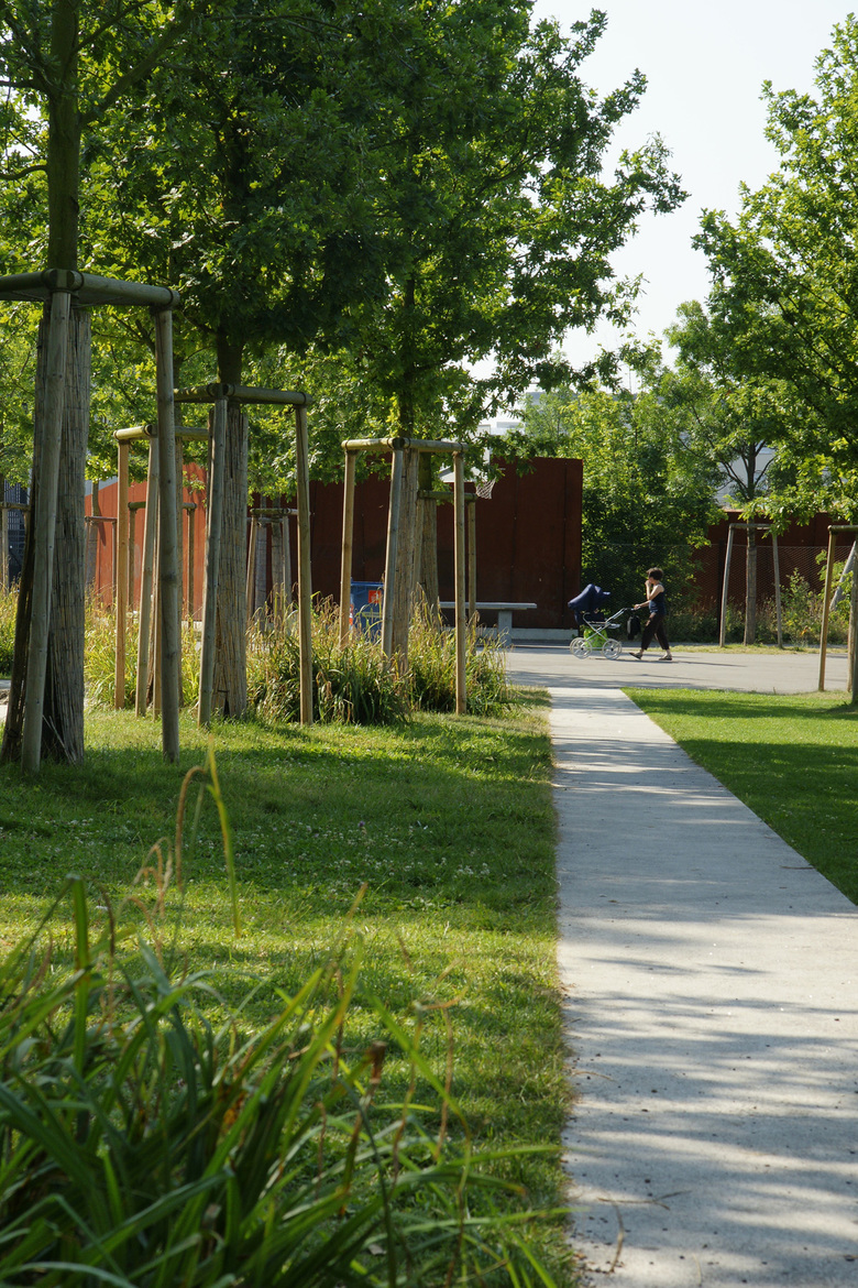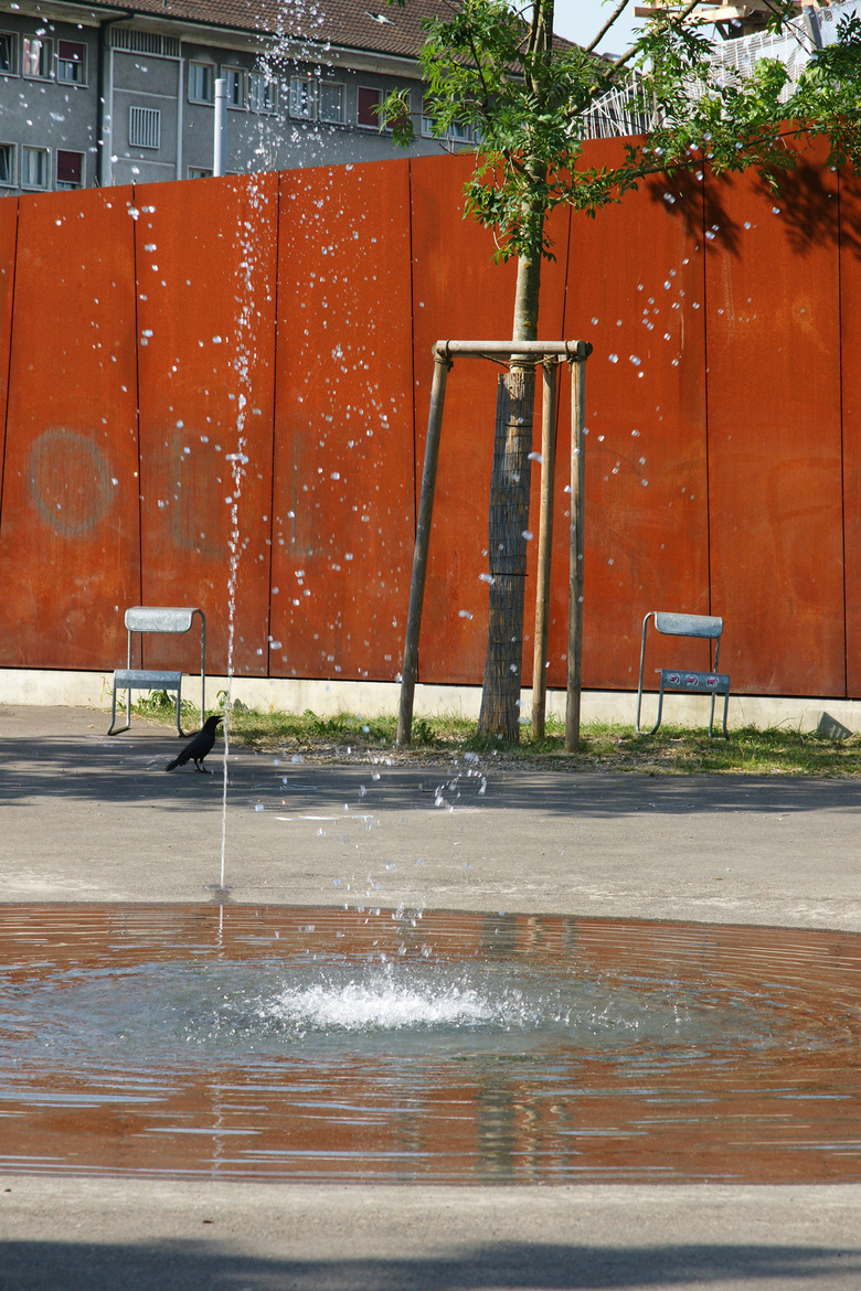 Ein umlaufender Weg mit Sitzbänken bietet Übersicht auf das Geschehen auf der Matte, auf dem Platz und im Hain. Ergänzend ermöglicht mobiles Mobiliar die individuelle Aneignung des Parkes.