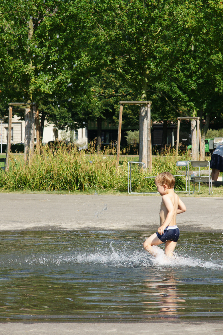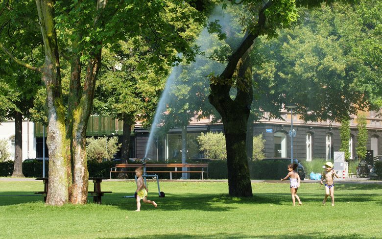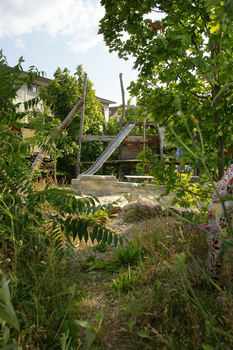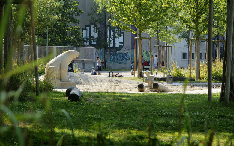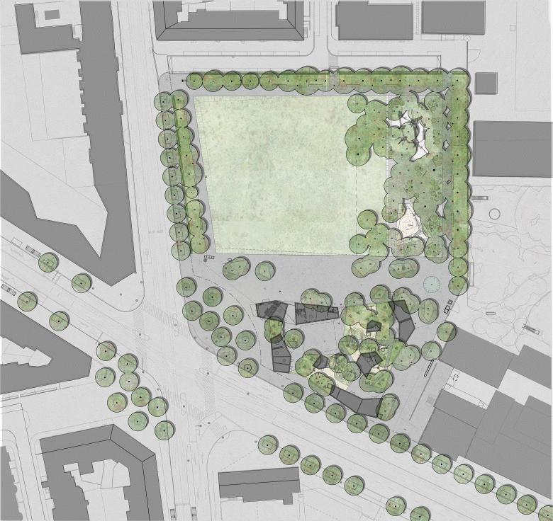 Der freiwerdende Bereich in der Tiefe des Parks wird als Rückzugs- und Spielort unter Bäumen ausgeformt. Ein Eichenhain mit locker eingestreuten Kleinstrauchgruppen nimmt verschiedene Funktionen auf: Eine vielfältige Spiellandschaft aus Holzstämmen mit Rutsche, Schaukel, und Netzen, sowie einen Kleinkindbereich mit Sand und Wasser.