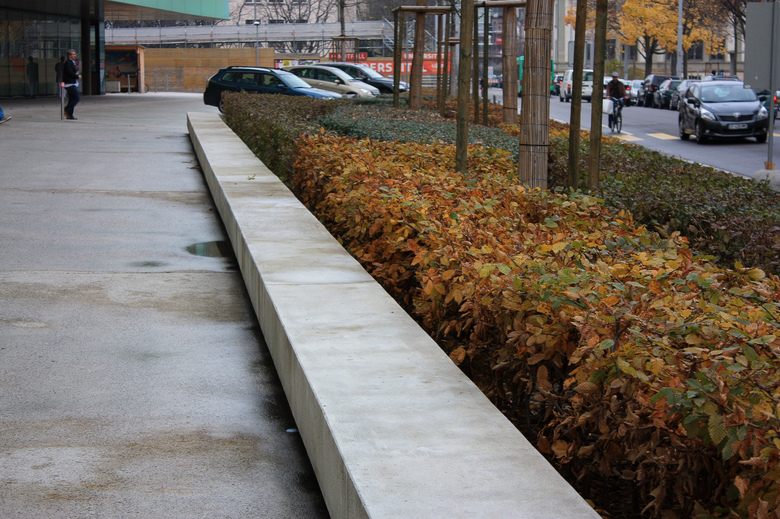 Entlang der westlichen Fassade am öffentlichen Durchgang sind Velo- und Motorstellplätze angeordnet. Zwischen der öffentlich Nutzung und dem Gebäude erzeugen vieleckige Heckenkörper notwendige Distanz zu den Behandlungszimmern im Erdgeschoss.