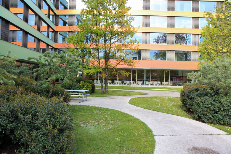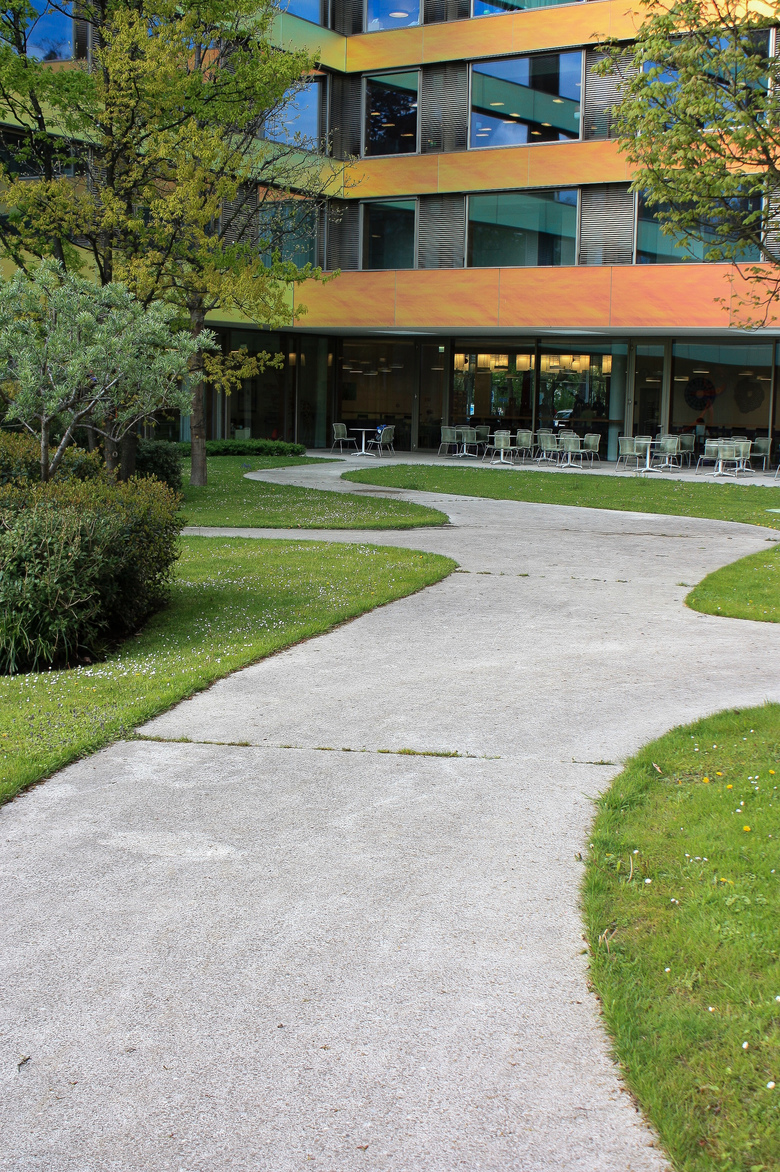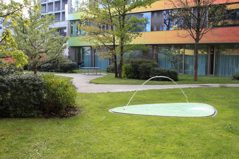 Durch die städtebauliche Setzung und die Geometrie des Neubaues gliedert sich die Umgebung in drei unterschiedliche Orte: Eingangsbereich, Innenhof sowie Velo- und Motorstellplatz.