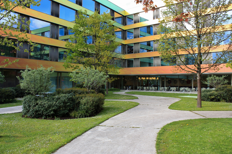 Die großzügige und transparente Eingangshalle ermöglicht durch die Cafeteria hindurch den Blick in den südorientierten Innenhof.