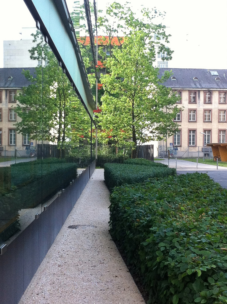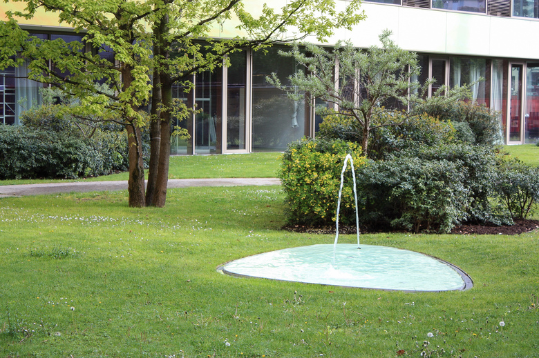 Ein flaches Wasserbecken spiegelt das Baumdach und das dezente Plätschern bricht den monotonen Verkehrslärm.