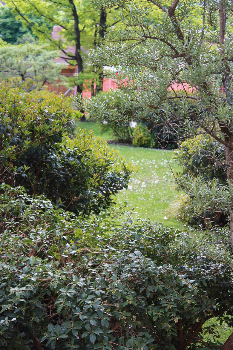 Immergrüne, amorphe Strauchkörper im Schotterrasen verstärken die üppige Erscheinung des Hofes als Kontrast zum städtischen Umfeld.