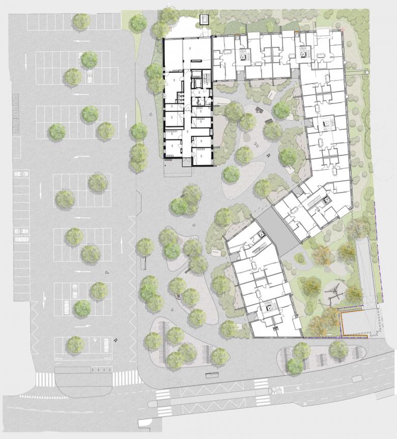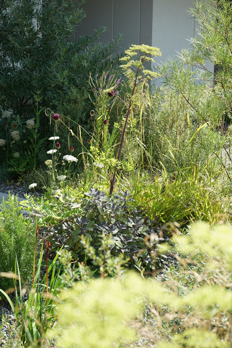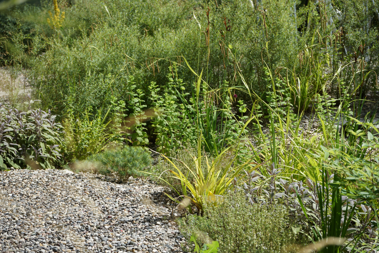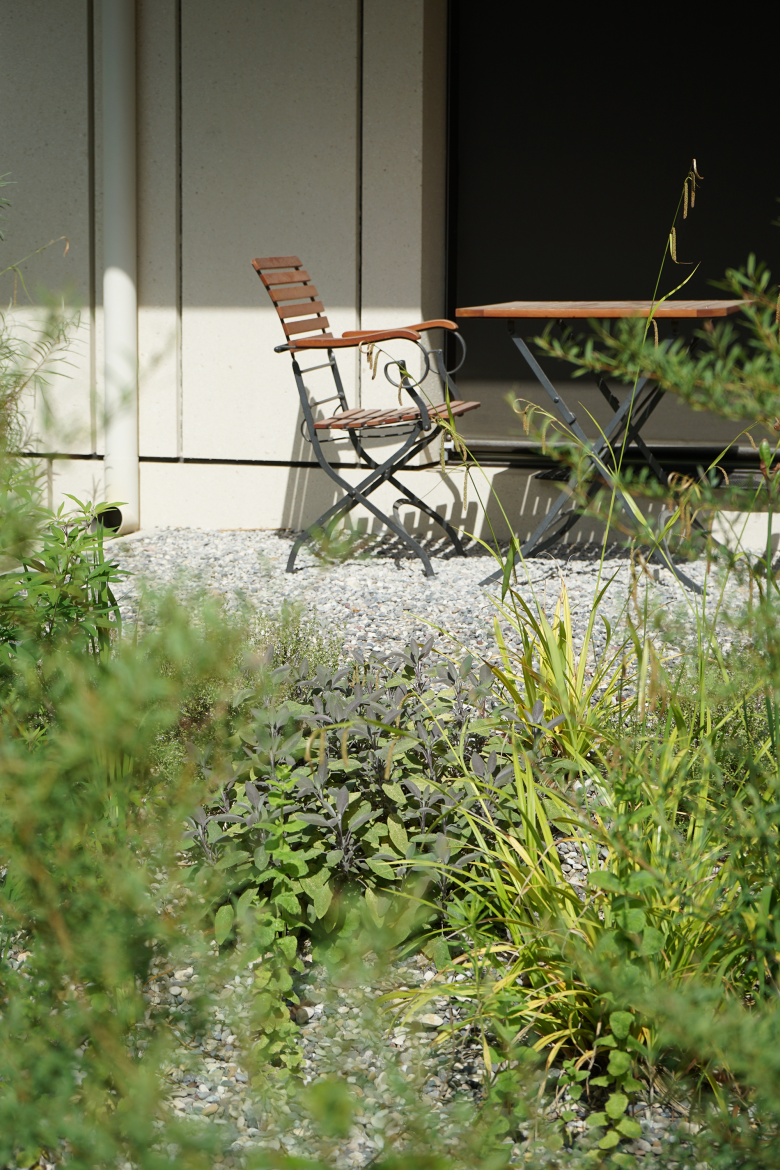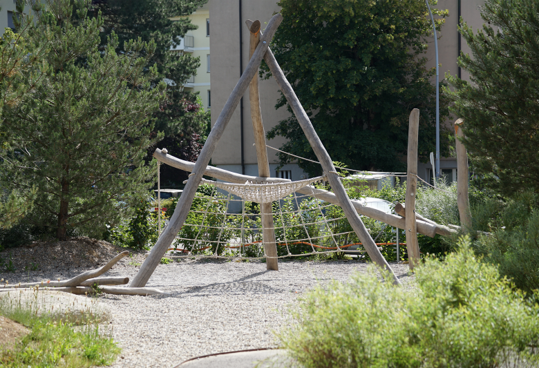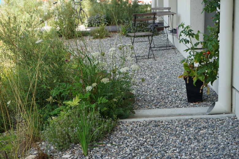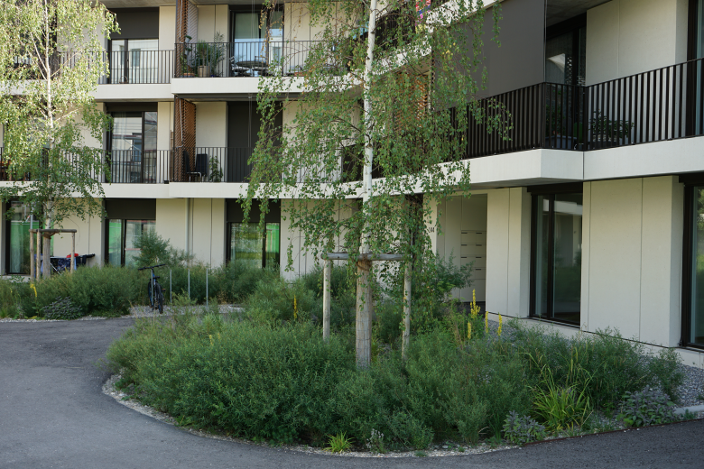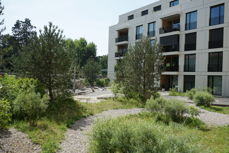 Die Aussenräume sind strassenseitig als öffentlich nutzbarer Begegnungsraum gestaltet. Die Sitzplätze entlang der Gebäudefassade werden durch strauchartig bepflanzte Sickermulden von der Öffentlichkeit zoniert. Gartenseitig erstreckt sich ein extensiv gepflegter, schmaler Grünraum mit einem aufgeweiteten hofartigem Spielplatz entlang dem Gebäudemäander. Dieser privat ausgerichtete Gartenraum grenzt direkt an die weitläufigen Familiengärten der Stadt Basel und öffnet sich mit Sicht auf die Vogesen und den Schwarzwald.