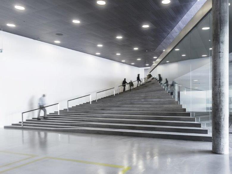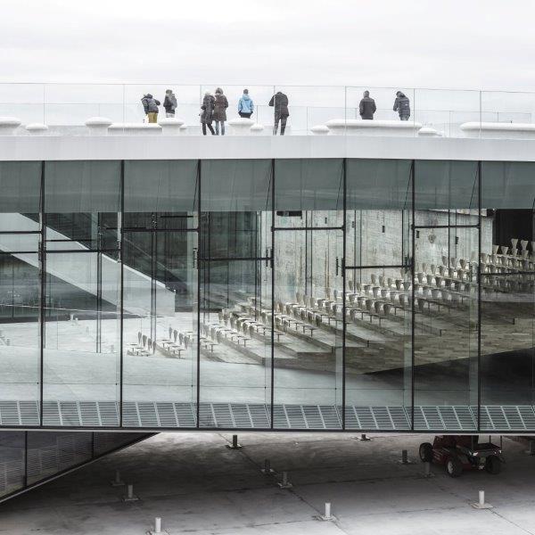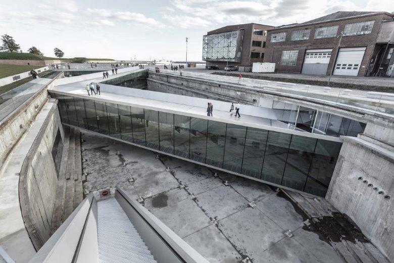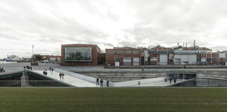 A series of three double-level bridges span the dry dock, serving both as an urban connection, as well as providing visitors with short-cuts to different sections of the museum. The harbor bridge closes off the dock while serving as harbor promenade; the museum’s auditorium serves as a bridge connecting the adjacent Culture Yard with the Kronborg Castle; and the sloping zig-zag bridge navigates visitors to the main entrance. This bridge unites the old and new as the visitors descend into the museum space overlooking the majestic surroundings above and below ground. The long and noble history of the Danish Maritime unfolds in a continuous motion within and around the dock, 7 meters (23 ft.) below the ground. All floors - connecting exhibition spaces with the auditorium, classroom, offices, café and the dock floor within the museum - slope gently creating exciting and sculptural spaces.