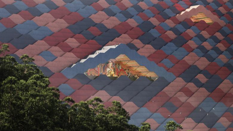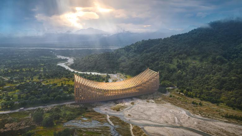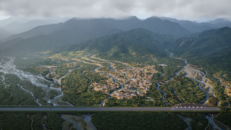 The future Gelephu Special Administration Region, located on the India-Bhutan border, will leverage its location and connectivity to South- and Southeast Asia to lay the foundation for the country’s future growth and create economic opportunities for its citizens through investments in green technology, education, and infrastructure. Designed by BIG’s Landscape and Urban Design Team, the masterplan includes a new international airport, railway connections, a hydroelectric dam, public spaces, and a language for local building typologies, based on the nine domains of GNH: Psychological Wellbeing, Health, Education, Living Standards, Time-Use, Ecological Diversity and Resilience, Good Governance, Cultural Diversity and Resilience, and Community Vitality.