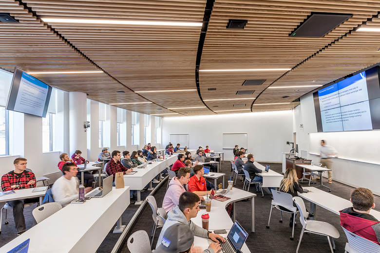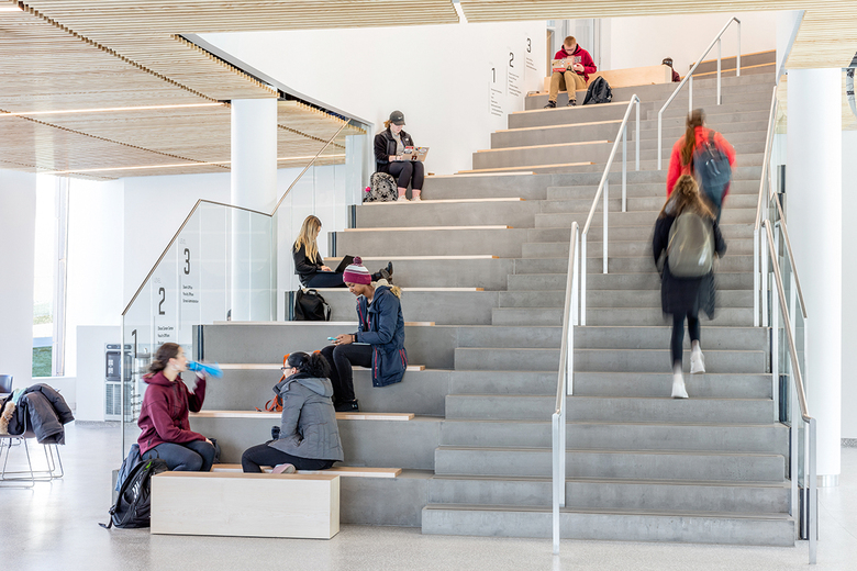 The Business Innovation Hub’s exterior is clad in copper, so long-term exposure to the elements will naturally weather the metal from a dark ochre to an enduring patina. With longevity and sustainability in mind, the building also targets LEED Silver certification. Upon entering, students and faculty arrive at the 5,000SF Learning Commons. Daylight peers between the accordion-like pillars to illuminate the multi-story atrium, where the heart of the business school hums with students learning, networking and dining. The bright and spacious Learning Commons doubles as an event venue for guest speakers, award ceremonies, banquets and career fairs. In any room or hallway, natural light reaches inside from both the campus and the inner courtyard.
