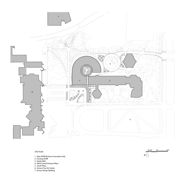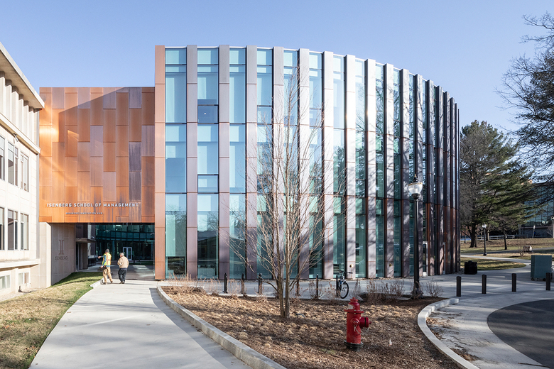 Prominently situated on Haigis Mall near the entrance to the campus, a dramatic triangular glass entrance created by a domino-effect greets students. The building exterior is wrapped in straight, vertical pillars that gradually slope downward, creating a distinct appearance without any curved elements. The Business Innovation Hub directly extends the school’s existing 1964 building from the north and east sides in a wide circular loop, linking back on the upper floors to maintain connectivity. The loop consolidates Isenberg’s faculty and staff under one roof, creating a singular place of arrival and a strong visual identity for the entire Isenberg School of Management.