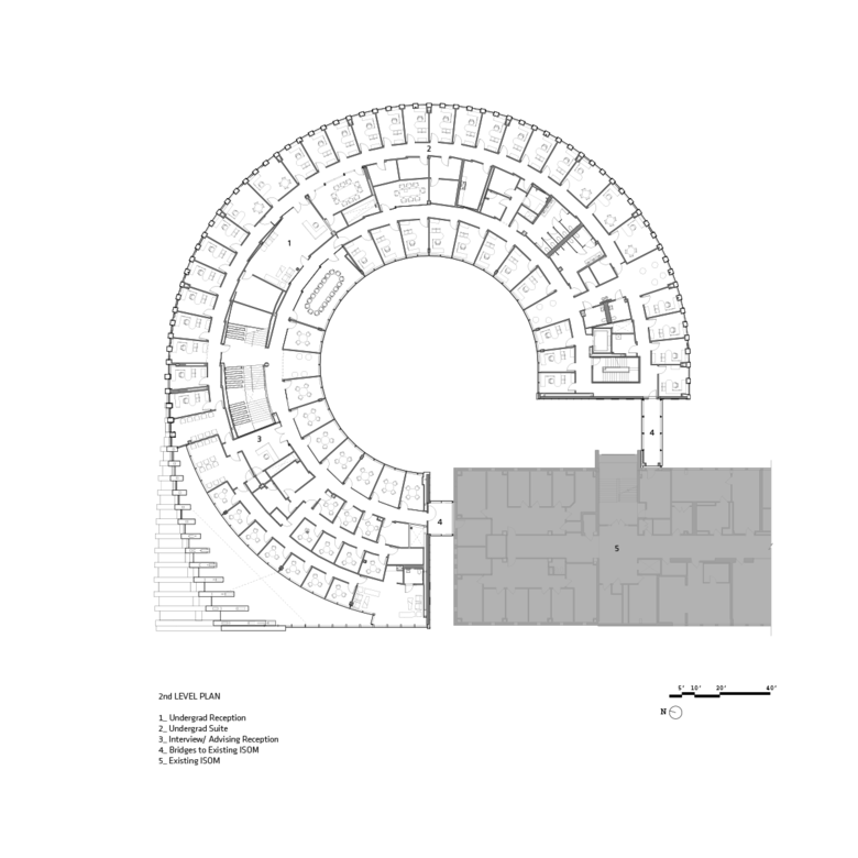 Throughout the Business Innovation Hub, spaces are designed with student interactions, teamwork and chance encounters in mind: soft chairs adorn the corridors, benches are affixed to the grand stairway and classroom chairs can easily maneuver for theater-style lectures or small-group work. On the second and third floors, students and staff occupy the innovation labs, advising spaces and faculty offices. To support the career development of every Isenberg student, classrooms are equipped with integrated technology for distance learning. In addition, the Chase Career Center gains 15 new interview rooms, and various conference rooms and breakout areas are distributed throughout the loop. The inner spaces of the extension face a circular courtyard, where an open-air garden and stone benches create an oasis for collaboration and contemplation. The courtyard connects back to the campus via two pathways between the original Isenberg building and the Business Innovation Hub. The buildings are fused by two bridges above the paths: the large bridge cloaked in copper becomes the gateway to the courtyard while the small bridge glazed with glass forms a visual continuity around the interior courtyard.