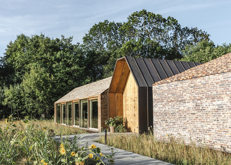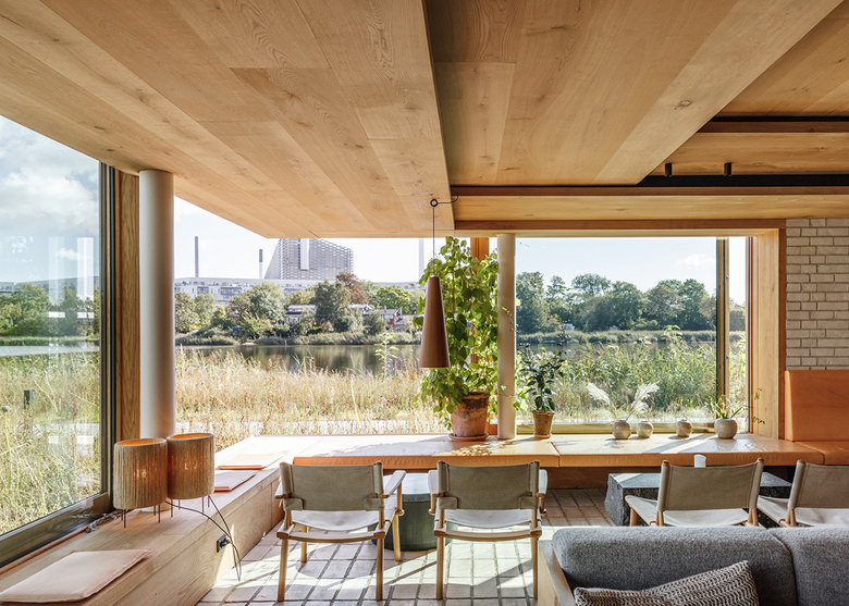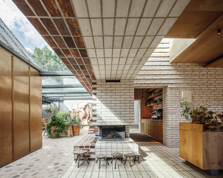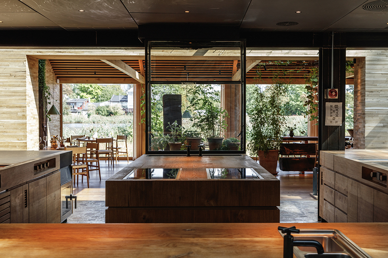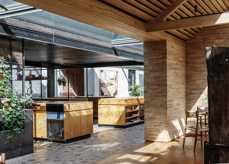 Each ‘building within the building’ is connected by glass covered paths for chefs and guests to follow the changes in weather, daylight and seasons - making the natural environment an integral part of the culinary experience. Guests have the opportunity to walk through each of the surrounding buildings and to experience a variety of Nordic materials and building techniques: the barbecue is a giant walk-in hut, and the lounge looks and feels like a giant, cozy fireplace made entirely of brick inside and out.