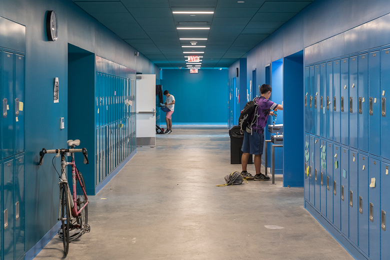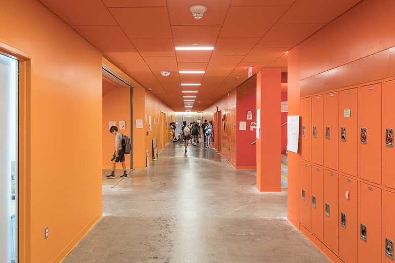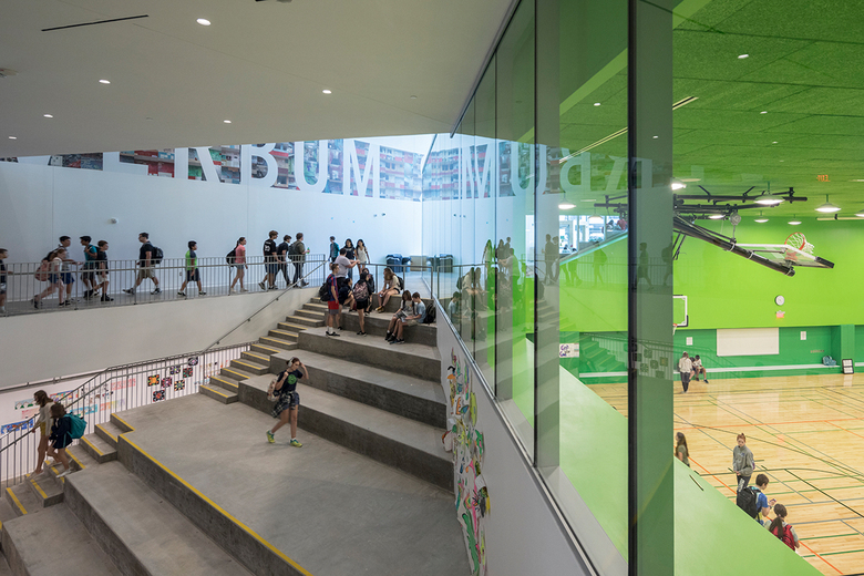 From Wilson Boulevard, students, teachers and staff are greeted by a triple-height lobby with stepped seating that double as an indoor gathering space for both student assemblies and public gatherings. Many of the school’s common spaces, including the 400-seat auditorium, main gymnasium, library, reception and cafeteria, are centrally located and directly adjacent to the lobby. Easy accessibility to the community-oriented programs hosted in the school encourages public interaction throughout the building, creating a welcoming environment while heightening the visual connectivity between the shared spaces. Other specialized student spaces include an art studio, science and robotic labs, music rehearsal rooms and two performing arts theaters.