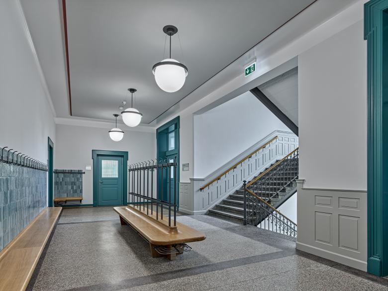 Das 1892 erbaute Schulgebäude an der Rosengartenstrasse ist im kommunalen Inventar der Denkmalpflege eingetragen und zeichnet sich durch grosse räumliche Qualitäten aus. Es repräsentiert den Typus des „Normalschulhauses“ aus der Zeit ab 1835 und besitzt die grössten und vermutlich am meisten lichtdurchfluteten Klassenzimmer der Stadt Zürich. Die Gesamtinstandsetzung beinhaltet eine Erdbebenertüchtigung, die Erneuerung der Gebäudehülle, die Sanierung der Klassenzimmer, Korridore und Garderoben, den Ausbau des Dachstocks mit neuem Lehrerbereich und Bibliothek, den Einbau eines Liftes, eines Mehrzweck- und Veranstaltungsraumes sowie Umnutzungen von Teilen des Untergeschosses. Um den Schallschutz an der hochfrequentierten Strasse zu verbessern, wurden neue Kastenfenster eingebaut mit Bezug auf die bauzeitlichen Doppelfenster. Die Gestaltungsidee des neuen Teambereichs im Dachstock sieht einen zentralen Mittelraum für Sitzungen und Pausen mit einem grossen Dachfenster mit Ausblick auf den benachbarten Kirchturm vor, welcher über transluzente, als Bücherregale konzipierte Trennwände zwei angrenzende, intimere Arbeitsräume mit Teeküche belichtet. Der Dachraum bleibt so trotz Unterteilung als Ganzes erlebbar. Im Rahmen der energetischen Verbesserung der Gebäudehülle wurde lediglich im Bereich des Wandtäfers bis auf mittlerer Raumhöhe eine innenseitige Wärmedämmung eingebaut. Diese Massnahme erhält die Speichermasse der Aussenwand und schafft eine Balance zwischen sommerlichem Wärmeschutz und angenehmer Behaglichkeit in der kalten Jahreszeit. Eine neue Lüftungszentrale in der Dachwinde versorgt das Gebäude mit Frischluft. Die Umgebungsgestaltung umfasst die Entsiegelung eines Grossteils der Fläche. Kletterrosen und verschiedene Rebsorten bewachsen die Fassade vertikal und tragen zu einem kühlen Mikroklima bei.