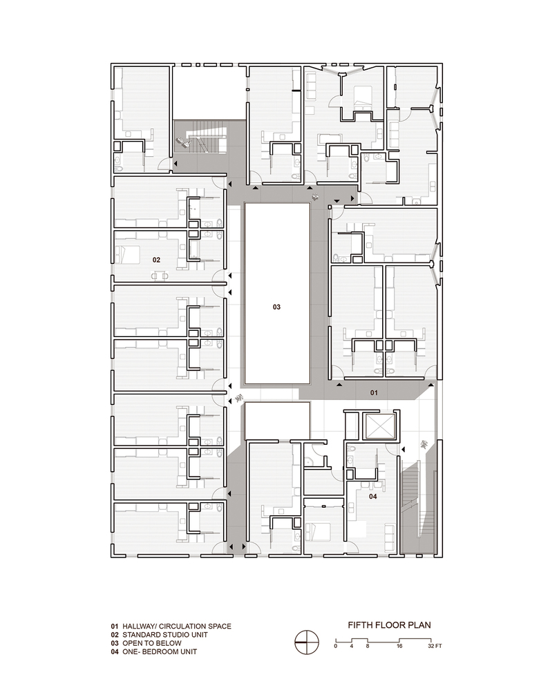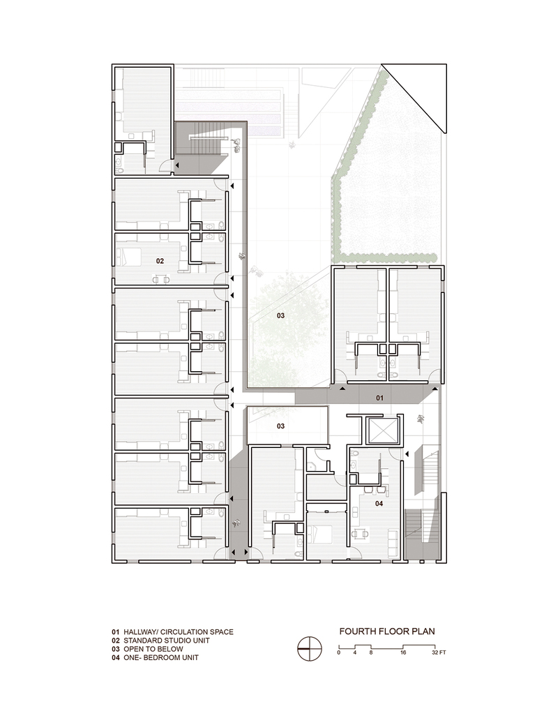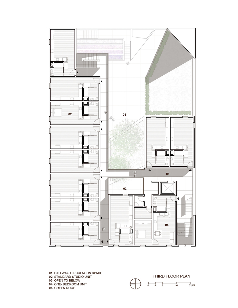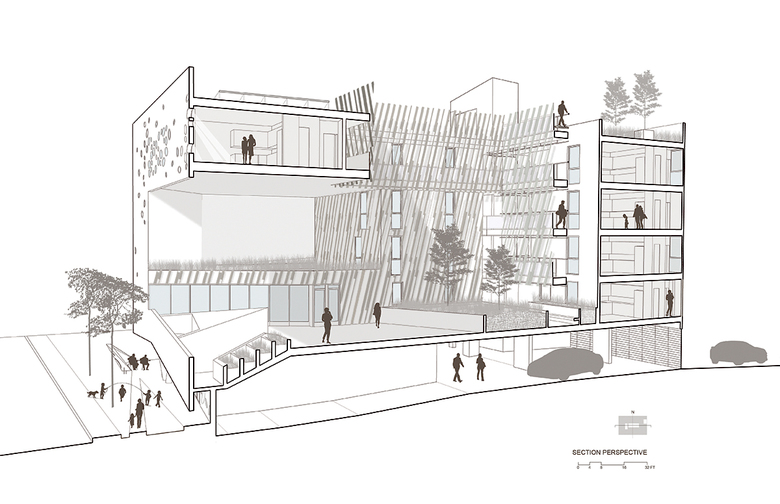 The ground level contains offices, support spaces for the veterans, bike storage and parking while the second level has a large public courtyard. Surrounded by four levels of housing units with balconies wrapped with a wood screen made from recycle planking the courtyard has large openings with green roofs that visually connects the space to the street on the lower level beyond. This allows the tenants to enjoy a secured open space while still connecting to the larger community.