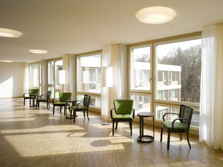 Im ersten Obergeschoss befinden sich die zwei Demenzabteilungen nebeneinander. Im zweiten bis zum vierten Obergeschoss sind sechs normale Abteilungen organisiert. Durch den Neubau können diese Abteilungen als 22er Zimmergruppen à je 24m2 zusammengefasst werden. Um die erforderlichen 170 Zimmer zu erreichen, wird im vierten Obergeschoss im östlichen Flügel eine zusätzliche Abteilung à 26 Zimmer vorgeschlagen, welche einen Zugang zum Dachgarten besitzt. Dies ermöglicht eine gewisse Flexibilität bei der Zunahme von dementen Bewohnern.