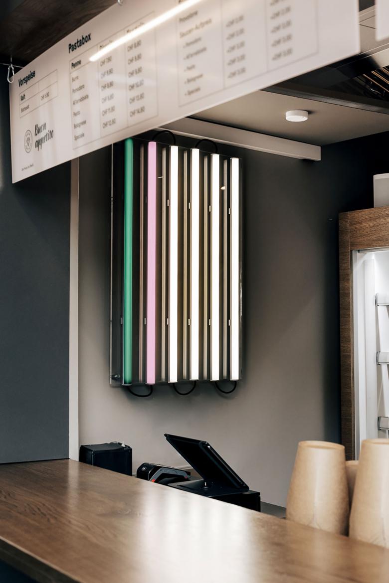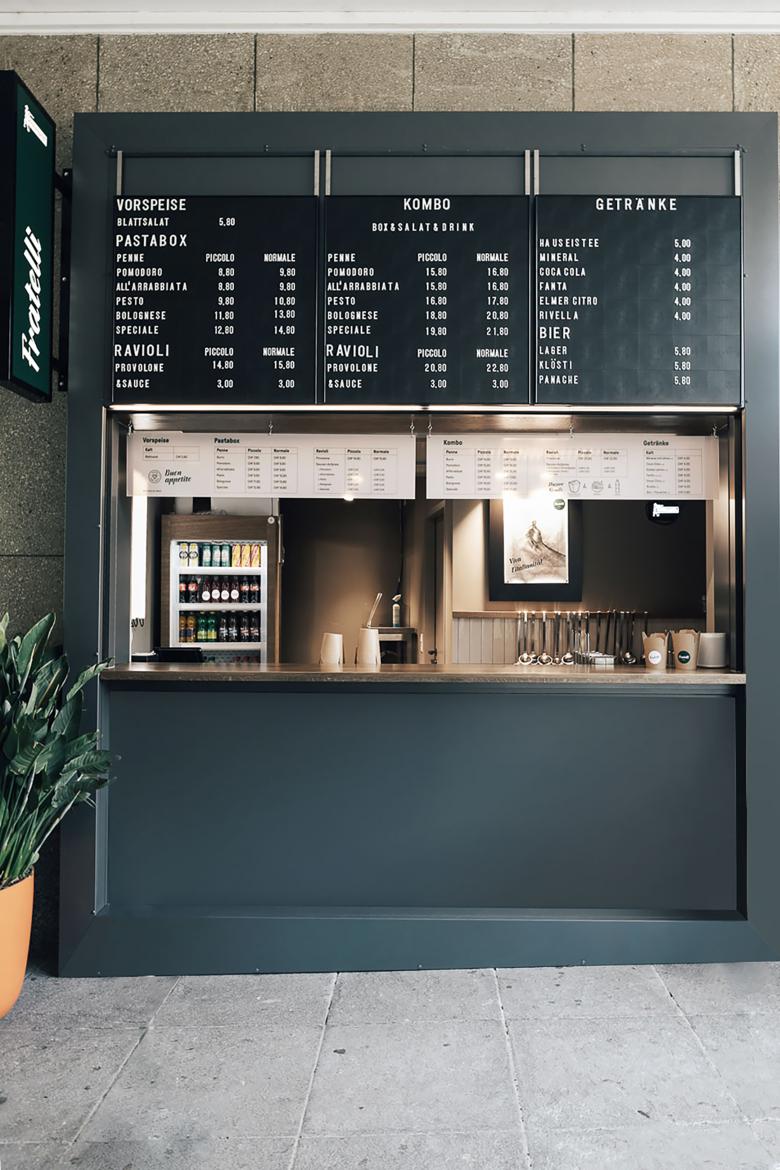 Verkauft wird „pasta per tutti“, Pasta wie bei Nonna, schnell und unkompliziert. Der 13 Quadratmeter Take Away liegt in einem überdachten Durchgang ganz in der Nähe des hochfrequentierten Marktplatzes inmitten der Stadt. Totale Einsicht und somit Nähe zum Kunden bietet das große Hubfester des Take Aways. Die Zubereitung der frischen Pasta kann live miterlebt werden. Farbliche Elemente der Innenarchitektur gehen Hand in Hand mit dem Branding. Die gewählte, doch nicht aufdringliche Gestaltung passt sich perfekt der Umgebung an.