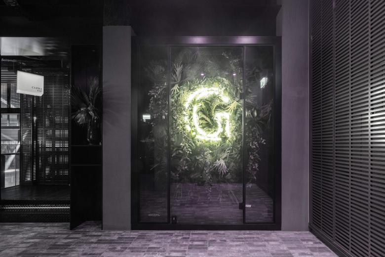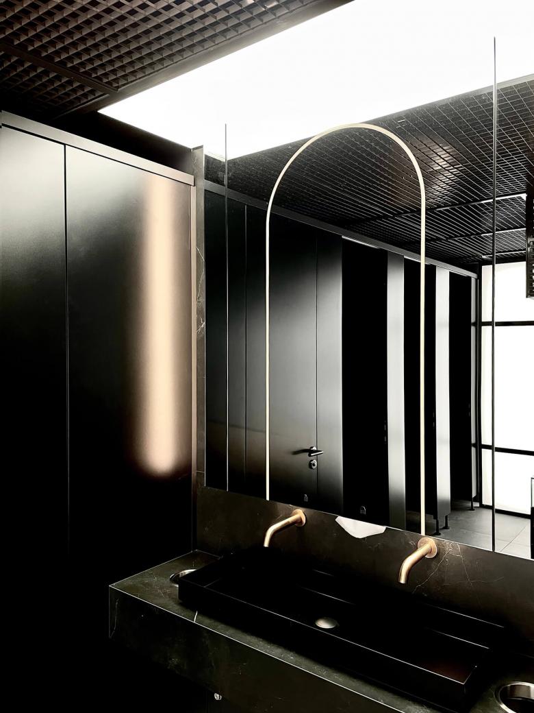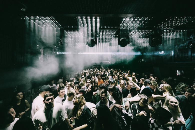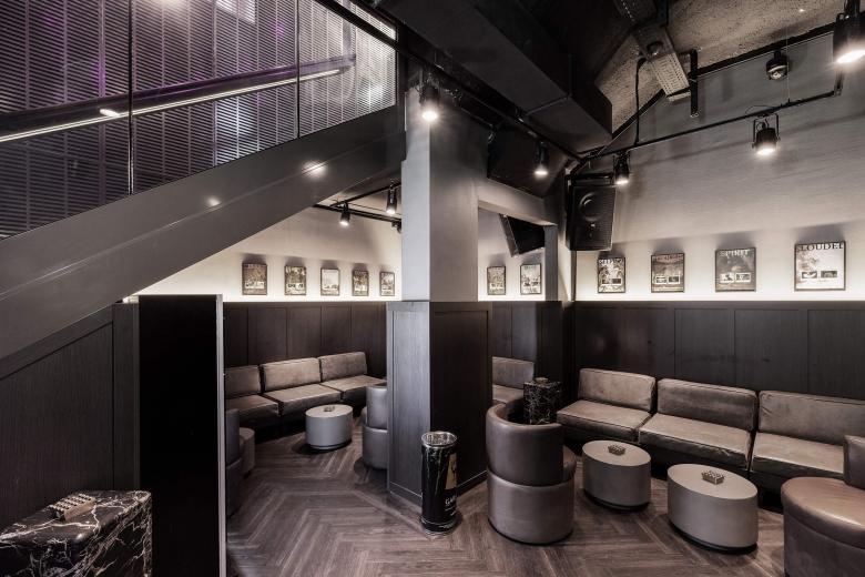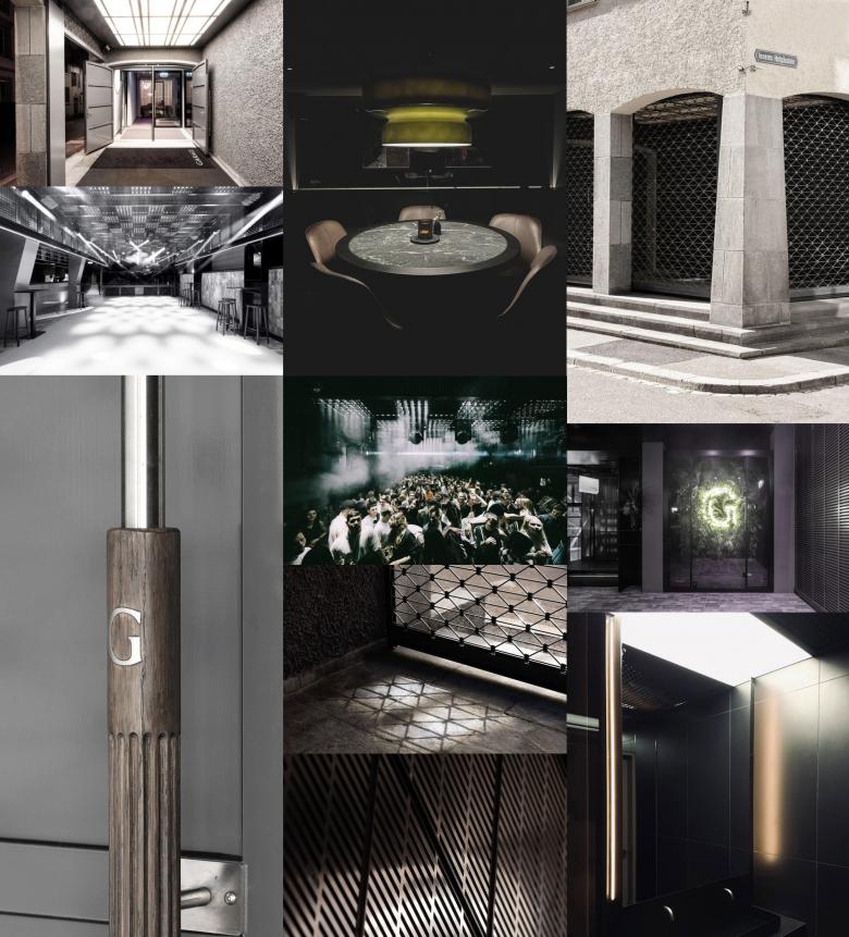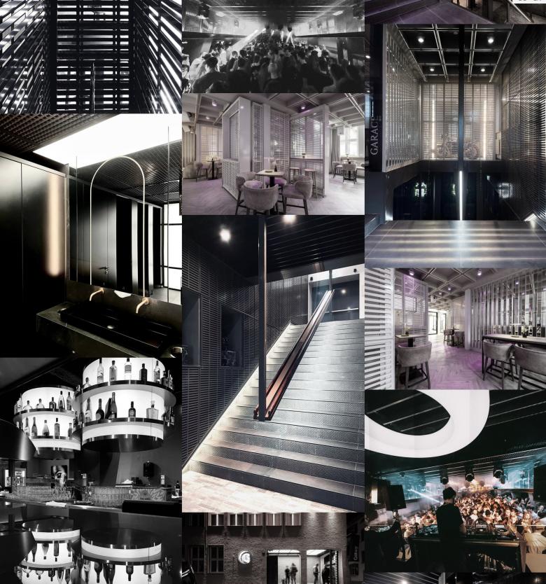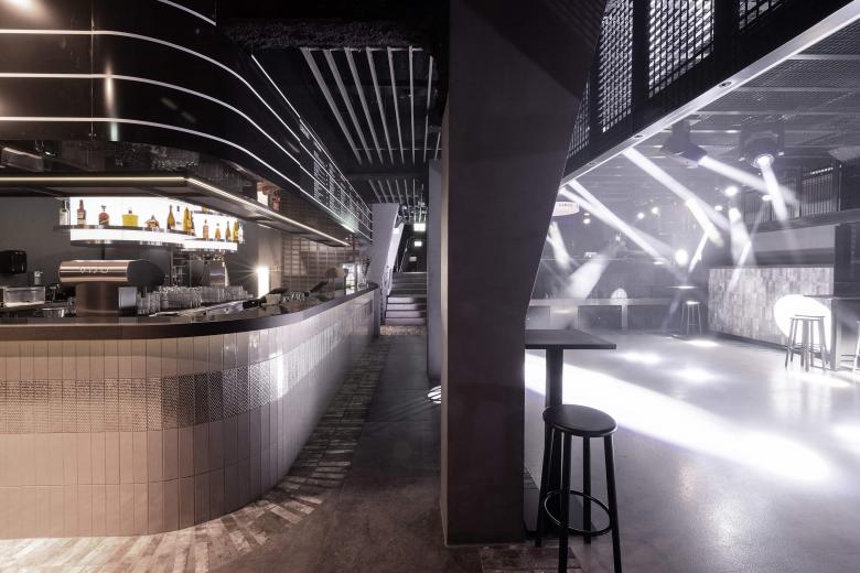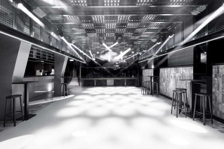 Im Untergeschoss befindet sich der eigentliche Club mit verschiedenen Ebenen. Fliesen an Boden und Wänden markieren die Räume und werden durch Elementen in Holzoptik ergänzt. Die metallischen, raumtrennende Elemente sind das raumprägende Material in der Location. Visuelles Herzstück hier, ist der einzigartige Architekturkorb über dem Dancefloor. Der gesamte Eindruck wird durch den gezielten Einsatz von Lichtkörper komplettiert.