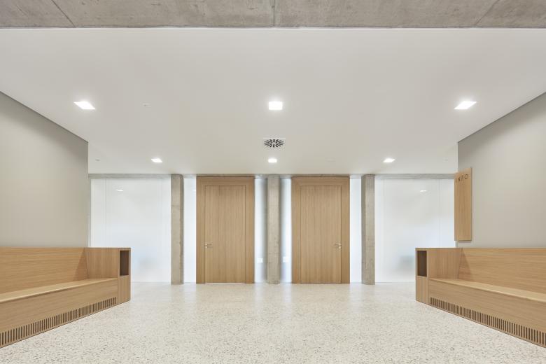 Barrierefrei erschlossen wird das Amtsgericht über zwei Torbögen. Die Garagentore der Rückseite wurden geöffnet und belichten die Gerichtssäle. Als Reminiszenz an die Holztore sind die Glasscheiben in der Tiefe versetzt angeordnet, was zu Spiegeleffekten führt und der Fassade bewegte Bildhaftigkeit verleiht. Das großzügige Foyer, von unprätentiöser Gestaltung, bringt die Würde des Gerichts zum Ausdruck. Die eingebrachte Stahlbetondecke, dem Ausdruck der abgebrochenen Plattenbalkendecke verhaftet, ist teilweise als Konstruktion sichtbar. Rau verputzte Wände in Hellgrau und der geschliffene Sichtestrich schaffen räumliche Tiefe und kontrastieren harmonisch mit dem Eichenholz der Raummöblierung. Neun asymmetrische Stahlbetonstützen greifen dynamisch das Spröde des früheren Zweckbaus auf. Die Büros für Richter und Mitarbeiter sowie die Registraturen sind in den Obergeschossen untergebracht. Neues greift hier mit ästhetischer Reduktion vorhandene räumliche Qualitäten auf. Das Hellgrau der Wände korrespondiert mit dem Grün-Grau der Holzfenster in freigelegten, gerundeten Laibungen.