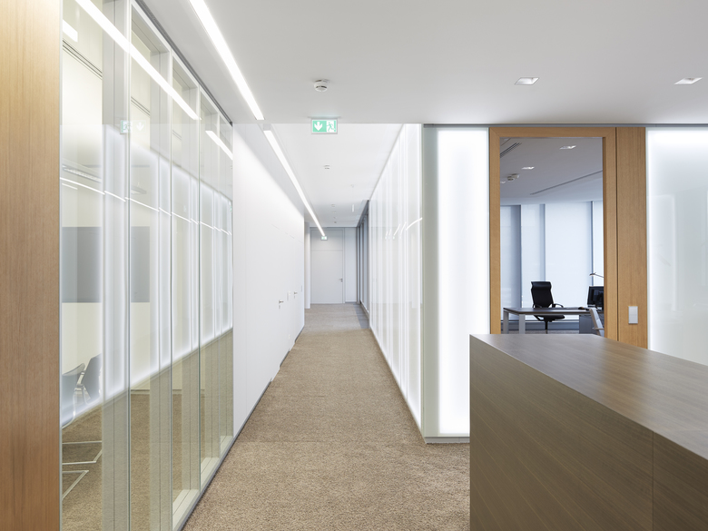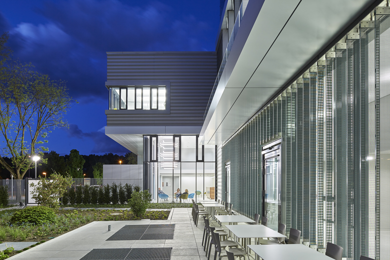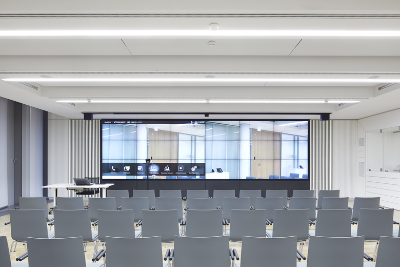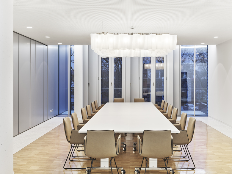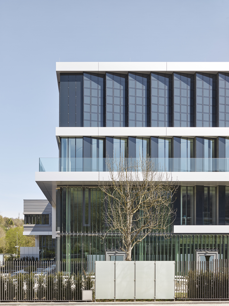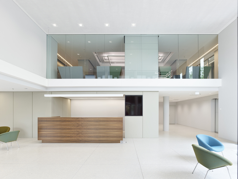 Der neue viergeschossige Baukörper und der Bestandbau sind funktional eng verwoben. Neugeordnete Betriebsabläufe ermöglichen die flexible Nutzung von Kantine und Schulungsflächen als Besprechungsbereich. Der Gesamtkomplex gliedert sich in verzahnte Kubaturen. Das horizontale Schichtungsmotiv der Fassade zeigt die funktionale Vielfalt des Gebäudes. Ein präzises Materialgefüge aus Aluminium und Glas spielt mit dem Bild eines medizinischen Hightech-Produktes und spiegelt das Unternehmensmotto: Perfection for Life.