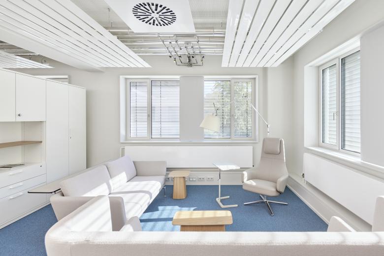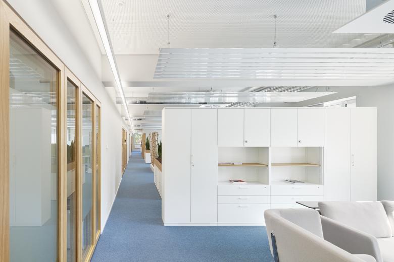 Der Baukörper wurde für die Baumaßnahme vollständig entkernt und bis auf den Rohbau zurückgeführt. Das Gebäude erfährt eine Vollsanierung. Alle drei Etagen sind identisch ausgebaut: Eine Mittelzone trennt die Bürofläche in zwei Abschnitte. Hier befinden sich Rückzugbüros, Verfügungsbüros, Sozialräume, Technikräume, Meetingpoints und eine großzügige Garderobe. Das Gebäude soll in Zukunft zwar fest definierte Abteilungen beherbergen aber keine festen Arbeitsplätze anbieten. Dem flexiblen Arbeiten zwischen Homeoffice und dem Arbeiten am Standort, dem papierlosen Büro und den variablen Arbeitszeit- und Teilzeitmodellen werden räumlich ressourcensparend beantwortet. Die Garderobe ist der Ort, wo in Schließfächern die persönlichen und arbeitsplatzgebundenen Unterlagen bewahrt und abgerufen werden.