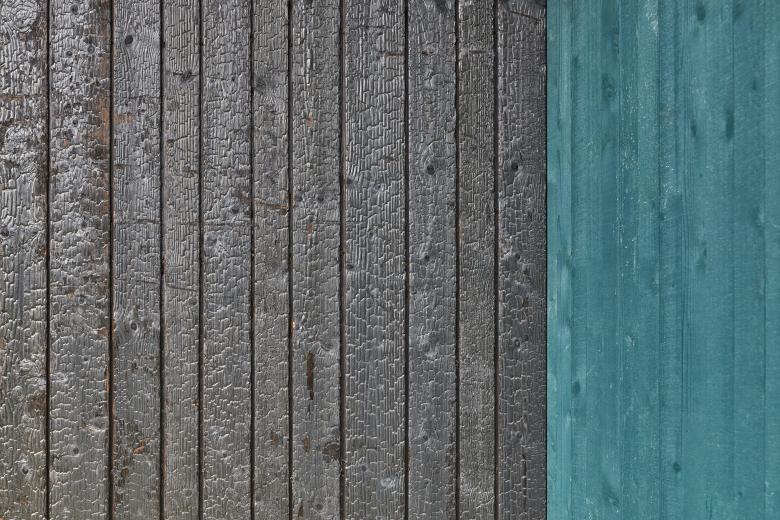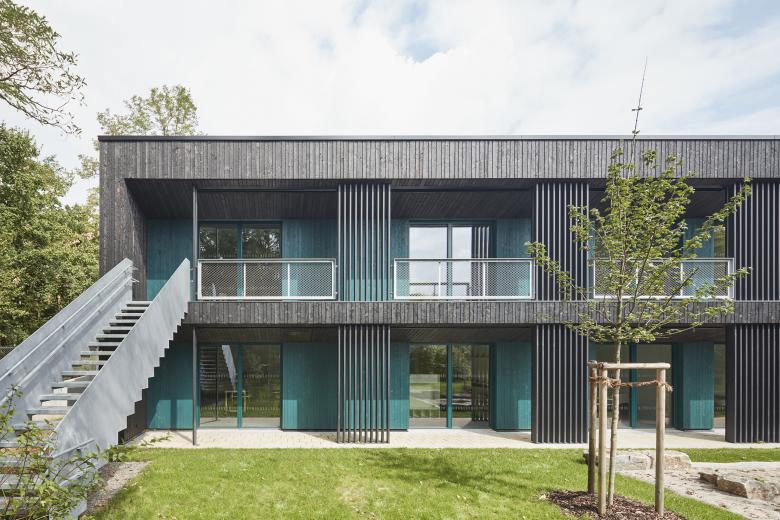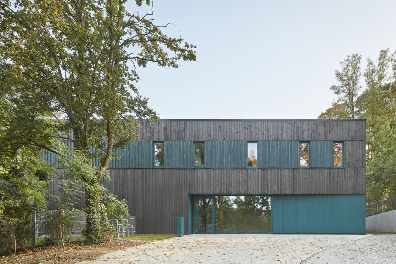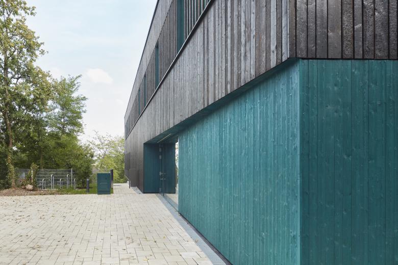 Die Holzfassade aus schwarz geflammter Fichte und rhythmisierend blaugrün lasierter Fichte wirkt verzaubernd mystisch. Der verglaste Eingang ist schräg in die Fassade eingelassen und liegt in einem Rahmen von intensiv leuchtender blaugrün lasierter Fichte.