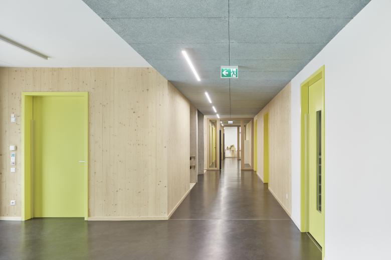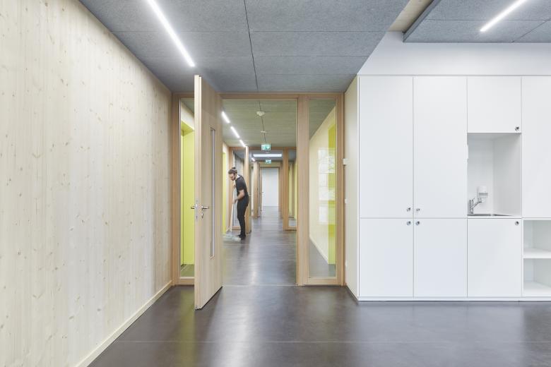 Die Raumordnung ist klar organisiert. Je ein breiter Mittelflur erschließt die Geschosse. Nach Norden liegen die bedienenden Räume, Richtung Süden mit Außenbezug die Aufenthaltsräume.