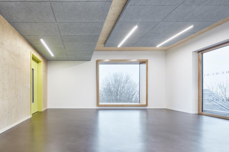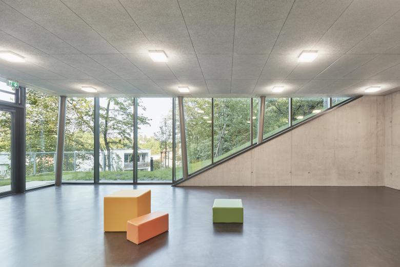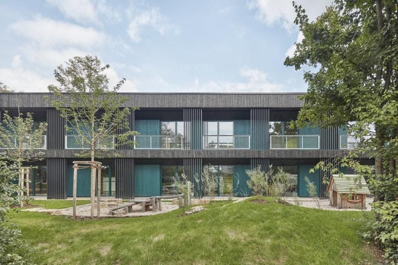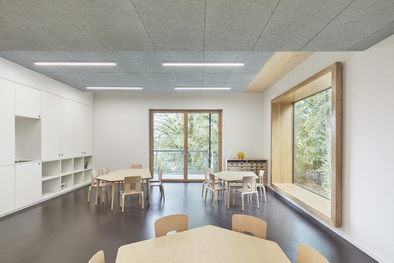 Modern ästhetische Formensprache verbunden mit natürlichen Materialien und Farbkontrasten schaffen einen Ort, der den Wunsch der Kinder nach einer narrativen Architektur erfüllt.