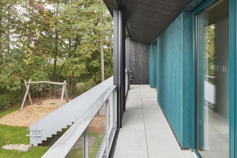 Die Laubengangkonstruktion der Südseite und filigran gruppierte Stahlstützen schaffen eine Zone, die Rückzug und Interaktion ermöglicht. Zwei feuerverzinkte Stahltreppen führen zum Spielgelände. Das Zusammenspiel von Holz und Stahl schafft ein kreatives Werkstatthaus für Kinder.