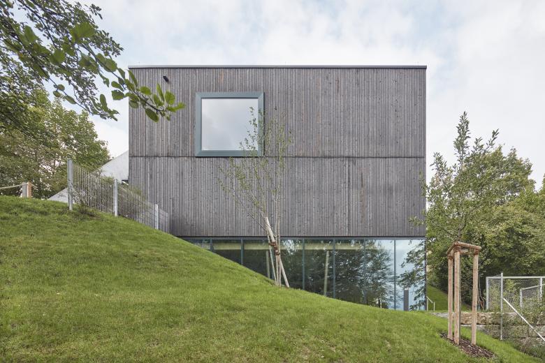 Dannien Roller Architekten + Partner gestalten das zweigeschossiges Holzhybridhaus mit erdein- gebundenem Hanggeschoss als architektonische Mimikry, dem baumbestandenen Gelände perfekt angepasst.