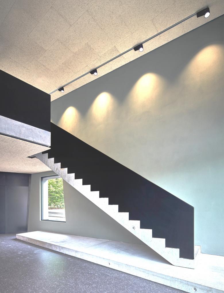 Die innere Nutzung spiegelt sich in der Reduzierung auf wenige Materialien wider: großflächige geschlossene Wandflächen in Beton bilden einen spannungsreichen Kontrast zu den Verglasungen der Fenster- und Torflächen. Eine sorgfältig verarbeitete Holzfassade im zweigeschossigen Gebäudeteil differenziert die Nutzräume der Feuerwehrbelegschaft und unterstreicht den haptischen Eindruck der Anlage.