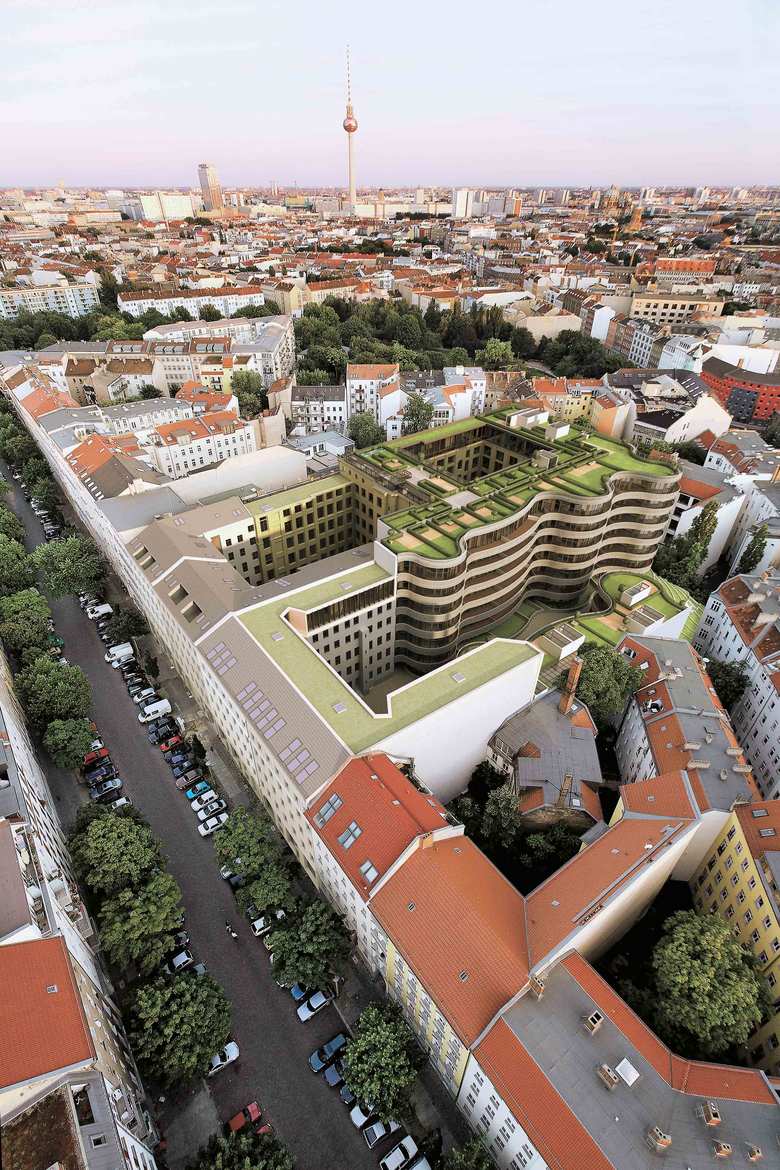 Genau hier – in einem Block, den 4 Straßen in die Form eines schiefen Trapezes bringen und den die für Berlin historisch typische Gemengelage von Wohnen und Arbeiten kennzeichnet – liegen die Fehrbelliner Höfe. Die 4 Vorderhäuser Fehrbelliner Straße 45 bis 48 führen mit ihren Seitenflügeln und Hinterhäusern weit und tief in den Block. Während es sich bei den Häusern 45 und 46 um klassische Berliner Mietshäuser handelt, folgt auf die kurzen 2 Seitenflügel der Häuser 47 und 48 eine durch und durch rational konzipierte Architektur: der gelbliche Ziegelbau einer Stockwerksfabrik aus dem Jahr 1876, der von den Secura Werken für Fein- und Elektromechanik genutzt wurde. Der neue Komplex schiebt sich indes durch das gesamte bauliche Gefüge, gehört doch zur Planung nicht allein die Reihe der 4 Häuser an der Fehrbelliner Straße im Nordosten, sondern auch das Haus Brunnenstraße 25 im Südwesten des Areals.