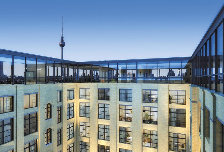 Insgesamt zählen die Fehrbelliner Höfe gut 150 Wohnungen zwischen knapp 60 und knapp 300 Quadratmetern, alle mit höchstem Komfort in Bezug auf ihre innere Ausstattung. Unter den Adressen Fehrbelliner Straße 47 und 48 stößt man auf Lofts mit harten Flächen, Kanten und Ecken, die zum Charakter des robusten Gebäudes der Secura Werke gehören. Unter den Adressen Fehrbelliner Straße 45 und 46 hingegen stößt man auf Wohnungen, deren Äußeres in weichen Formen schwingt. Dank der Durchwegung und Durchgrünung des erheblich fallenden Geländes – hinten terrassiert und gärtnerisch gestaltet – fühlt man sich hier mitten in »Natur«. Und das in sonst dichtest bebauter Umgebung.