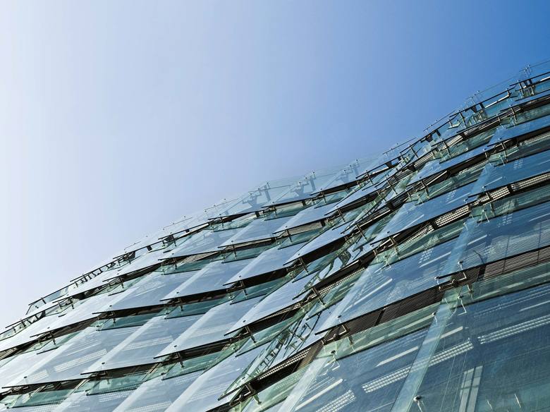 Die gewellten Fassaden mit ihren links drei, rechts zwei Achsen – bei denen sich, nach Art von Schuppen, die jeweils linke Kante der einen Scheibe über die jeweils rechte Kante der andern Scheibe schiebt – hängen von leicht gekrümmten »Bumerangs« im Abstand vor den öffenbaren Fenstern der Büros. Zusammen wirken die beiden Fassaden wie der Vorhang eines Theaters, der eben nach links und rechts zur Seite gezogen wird, um den Blick auf die Bühne freizugeben.